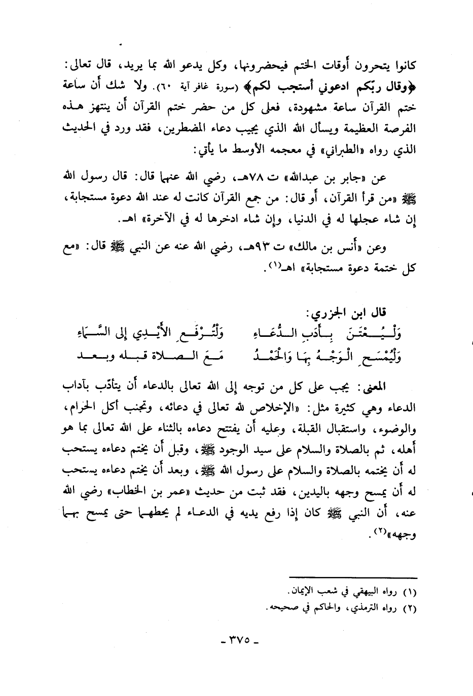 وَقالَ رَبُّكُمُ ادْعُونِي أَسْتَجِبْ لَكُمْ (سورة غافر آية 60). ولا شك أن ساعة ختم القرآن ساعة مشهودة، فعلى كل من حضر ختم القرآن أن ينتهز هذه الفرصة العظيمة ويسأل الله الذي يجيب دعاء المضطرين،