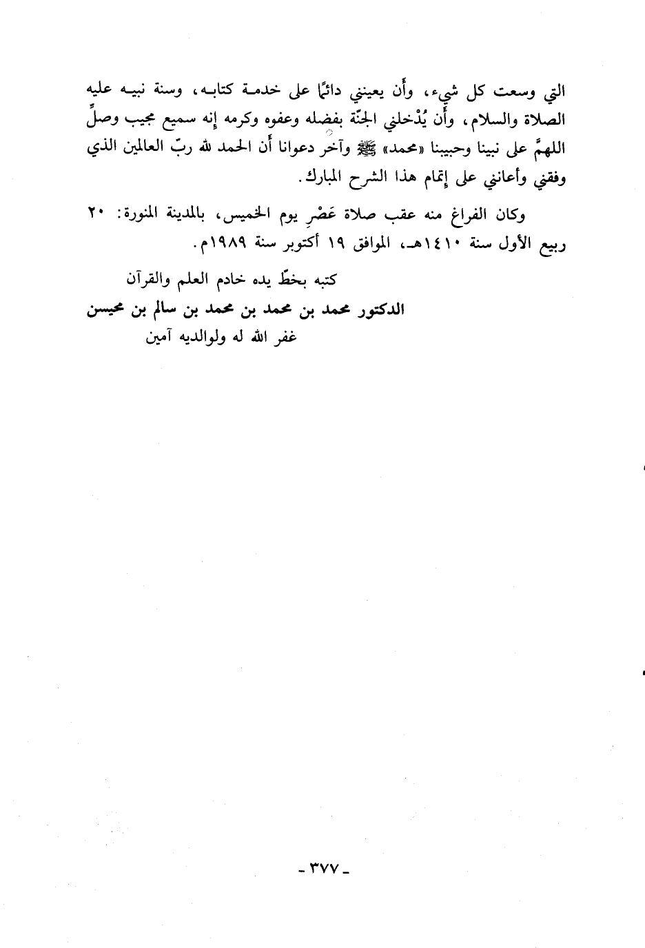 كتبه بخطّ يده خادم العلم والقرآن الدكتور محمد بن محمد بن محمد بن سالم بن محيسن غفر الله له ولوالديه آمين
