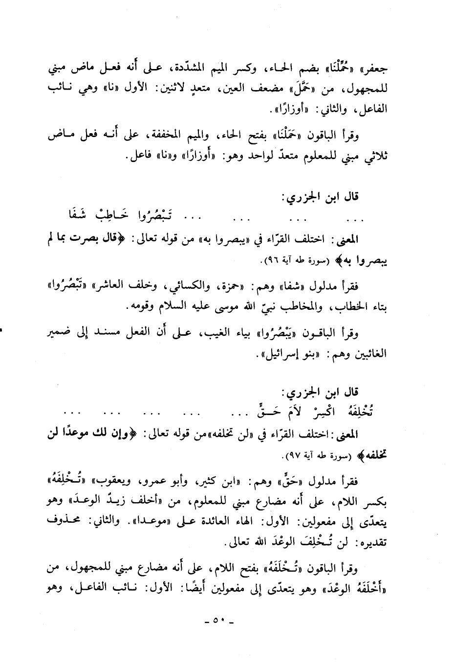 جعفر» «حمّلنا» بضم الحاء، وكسر الميم المشدّدة، على أنه فعل ماض مبني للمجهول، من «حمّل» مضعف العين، متعد لاثنين: الأول «نا» وهي نائب الفاعل، والثاني: «أوزارا».