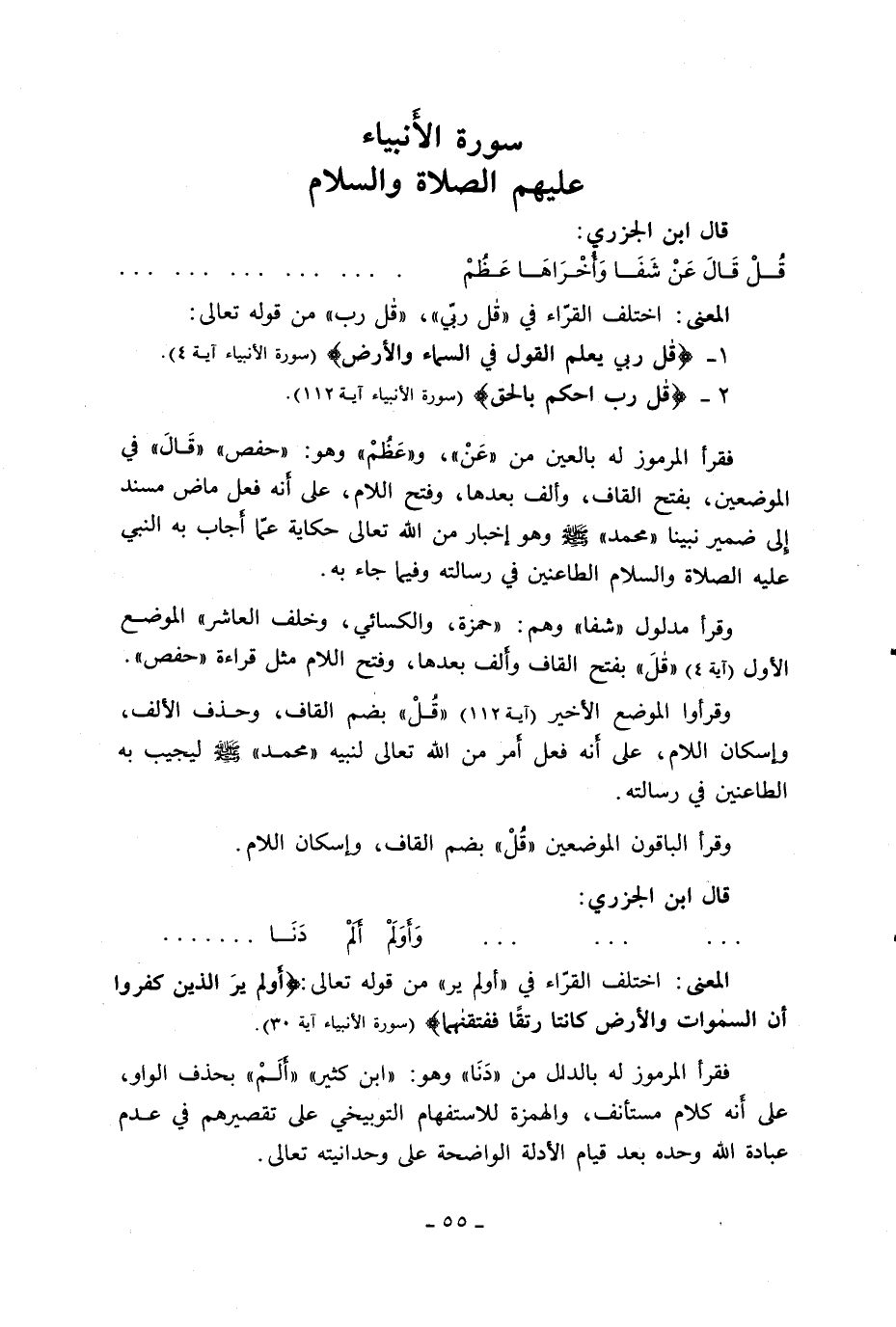 وقرءوا الموضع الأخير (آية 112) «قل» بضم القاف، وحذف الألف، وإسكان اللام، على أنه فعل أمر من الله تعالى لنبيه «محمد» صلى الله عليه وسلم ليجيب به الطاعنين في رسالته.