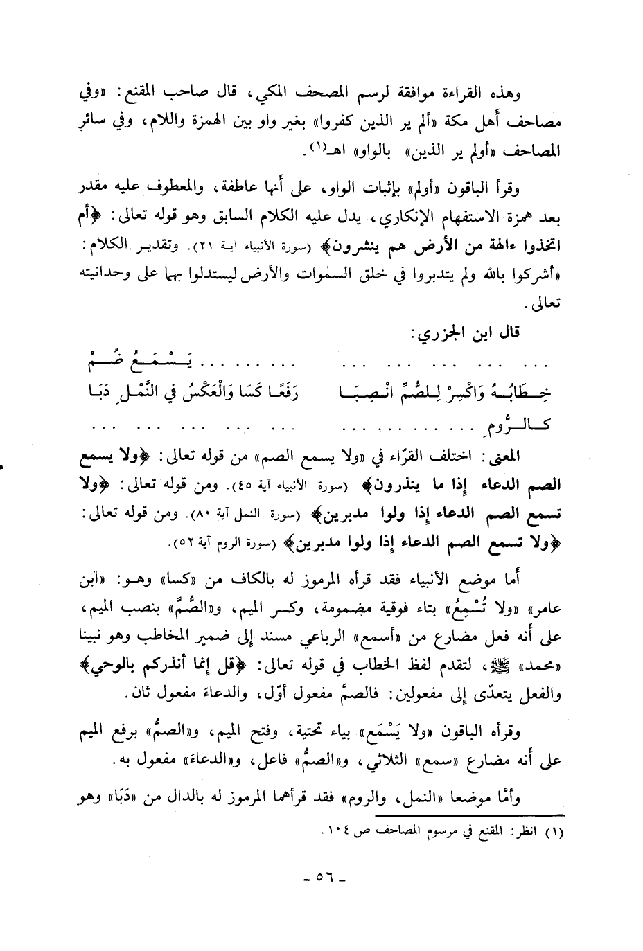المعنى: اختلف القرّاء في «ولا يسمع الصم» من قوله تعالى: وَلا يَسْمَعُ الصُّمُّ الدُّعاءَ إِذا ما يُنْذَرُونَ (سورة الأنبياء آية 45). ومن قوله تعالى: وَلا تُسْمِعُ الصُّمَّ الدُّعاءَ إِذا وَلَّوْا مُدْبِرِينَ (سورة النمل آية 80). ومن قوله تعالى: