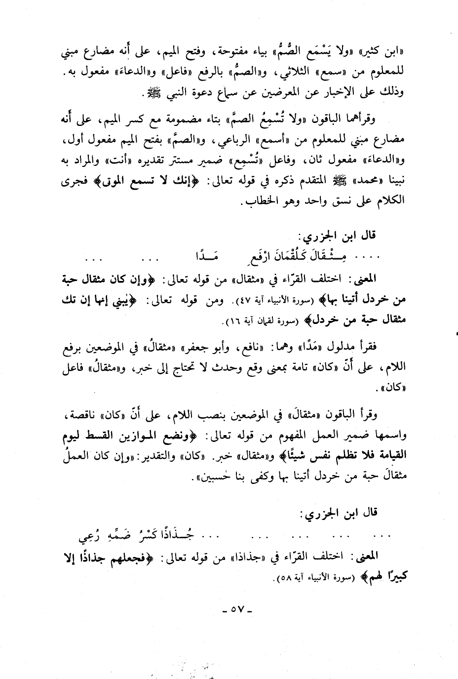 المعنى: اختلف القرّاء في «مثقال» من قوله تعالى: وَإِنْ كانَ مِثْقالَ حَبَّةٍ مِنْ خَرْدَلٍ أَتَيْنا بِها (سورة الأنبياء آية 47). ومن قوله تعالى: يا بُنَيَّ إِنَّها إِنْ تَكُ مِثْقالَ حَبَّةٍ مِنْ خَرْدَلٍ (سورة لقمان آية 16).