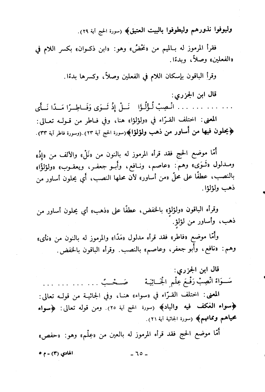 أمّا موضع الحج فقد قرأه المرموز له بالنون من «نل» والألف من «إذ» ومدلول «ثوى» وهم: «عاصم، ونافع، وأبو جعفر، ويعقوب» «ولؤلؤا» بالنصب، عطفا على محلّ «من أساور» لأن محلها النصب، أي يحلون أساور من ذهب ولؤلؤا.