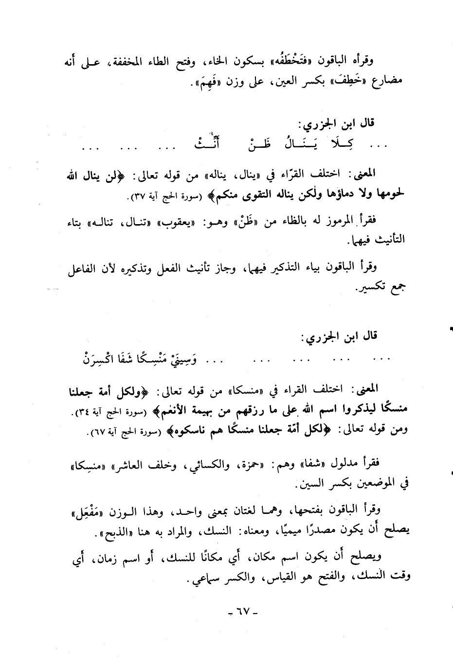 فقرأ مدلول «شفا» وهم: «حمزة، والكسائي، وخلف العاشر» «منسكا» في الموضعين بكسر السين.