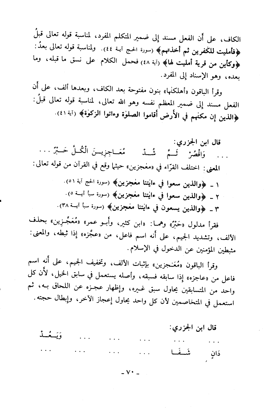 وقرأ الباقون «معجزين» بإثبات الألف، وتخفيف الجيم، على أنه اسم فاعل من «عاجزه» إذا سابقه فسبقه، وأصله يستعمل في سابق الخيل، لأن كل واحد من المتسابقين يحاول سبق غيره، وإظهار عجزه عن اللحاق به، ثم استعمل في المتخاصمين لأن كل واحد يحاول إعجاز الآخر، وإبطال حجته.