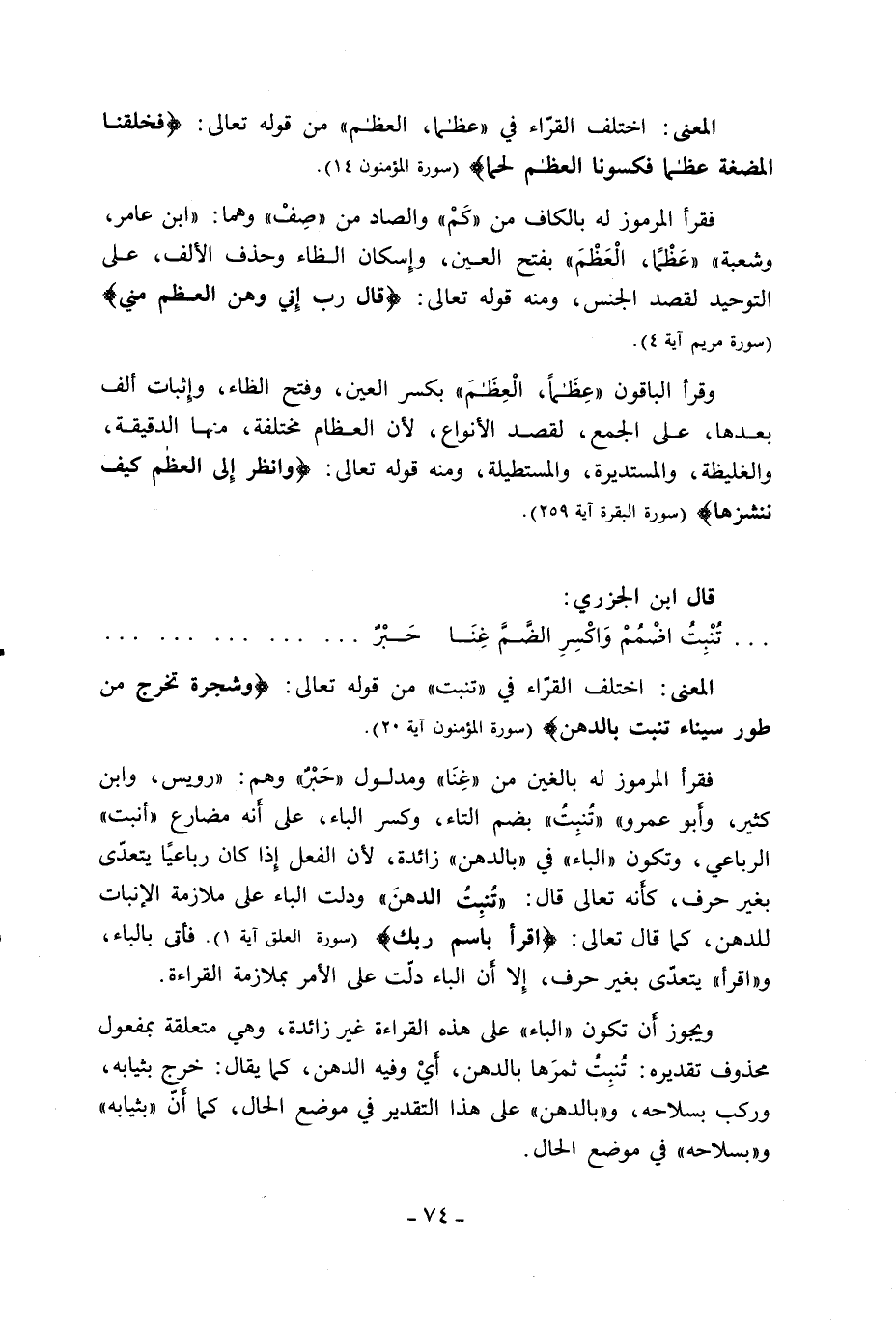 فقرأ المرموز له بالغين من «غنا» ومدلول «حبر» وهم: «رويس، وابن كثير، وأبو عمرو» «تنبت» بضم التاء، وكسر الباء، على أنه مضارع «أنبت» الرباعي، وتكون «الباء» في «بالدهن» زائدة، لأن الفعل إذا كان رباعيا يتعدّى بغير حرف، كأنه تعالى قال: «تنبت الدهن» ودلت الباء على ملازمة الإنبات للدهن، كما قال تعالى: اقْرَأْ بِاسْمِ رَبِّكَ (سورة العلق آية 1). فأتى بالباء، و «اقرأ» يتعدّى بغير حرف، إلا أن الباء دلّت على الأمر بملازمة القراءة.