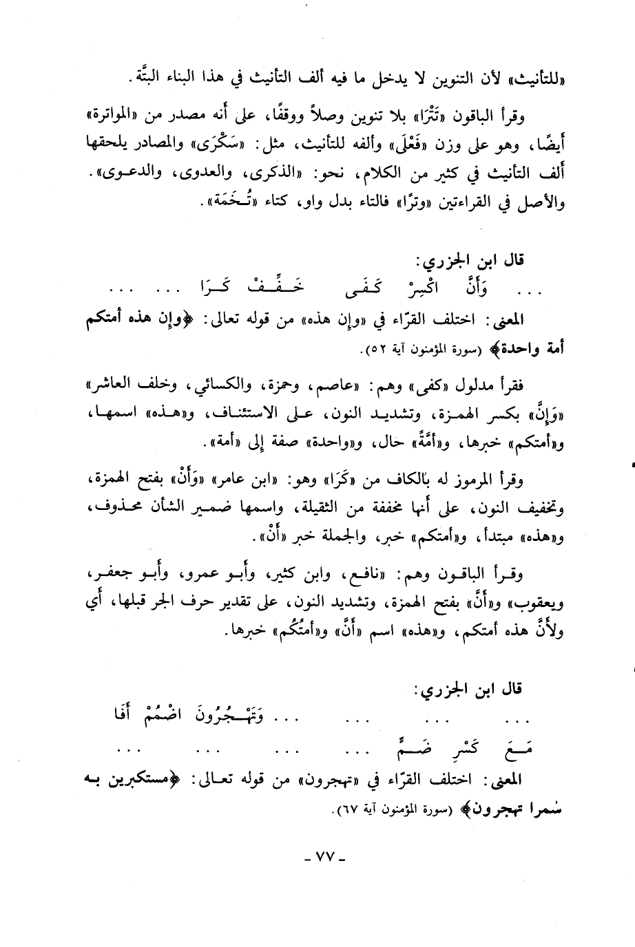 وقرأ الباقون «تترا» بلا تنوين وصلا ووقفا، على أنه مصدر من «المواترة» أيضا، وهو على وزن «فعلى» وألفه للتأنيث، مثل: «سكرى» والمصادر يلحقها ألف التأنيث في كثير من الكلام، نحو: «الذكرى، والعدوى، والدعوى».