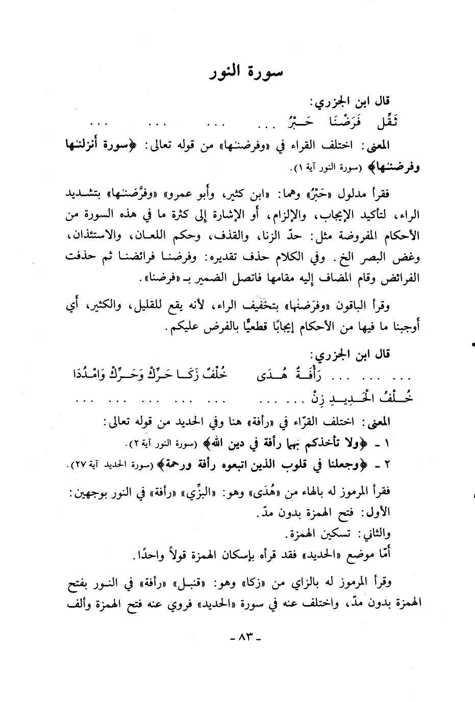 فقرأ مدلول «حبر» وهما: «ابن كثير، وأبو عمرو» «وفرّضنها» بتشديد الراء، لتأكيد الإيجاب، والإلزام، أو الإشارة إلى كثرة ما في هذه السورة من الأحكام المفروضة مثل: حدّ الزنا، والقذف، وحكم اللعان، والاستئذان، وغض البصر الخ. وفي الكلام حذف تقديره: وفرضنا فرائضنا ثم حذفت الفرائض وقام المضاف إليه مقامها فاتصل الضمير ب «فرضنا».