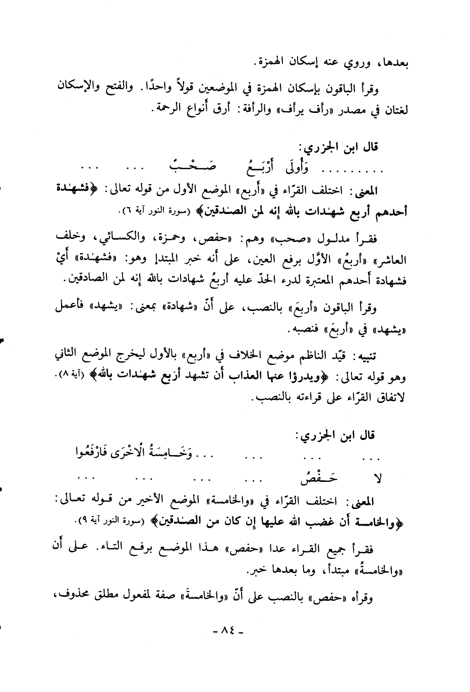 فقرأ مدلول «صحب» وهم: «حفص، وحمزة، والكسائي، وخلف العاشر» «أربع» الأوّل برفع العين، على أنه خبر المبتدإ وهو: «فشهدة» أيّ فشهادة أحدهم المعتبرة لدرء الحدّ عليه أربع شهادات بالله إنه لمن الصادقين.