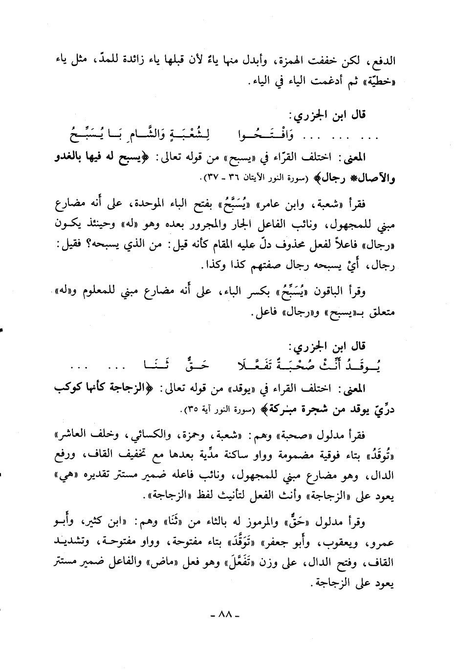 المعنى: اختلف القرّاء في «يسبح» من قوله تعالى: يُسَبِّحُ لَهُ فِيها بِالْغُدُوِّ وَالْآصالِ* رِجالٌ (سورة النور الآيتان 36 - 37).