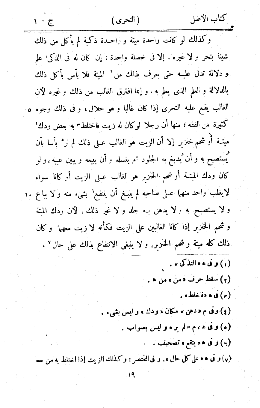 وَكَذَلِكَ لَو كَانَت وَاحِدَة ميتَة وَوَاحِدَة ذكية لم يَأْكُل من ذَلِك شَيْئا بتحر وَلَا غَيره إِلَّا فِي خصْلَة وَاحِدَة إِن كَانَ لَهُ فِي الذكي علم وَدلَالَة تدل عَلَيْهِ حَتَّى يعرف بذلك من الْميتَة فَلَا بَأْس بِأَكْل ذَلِك بِالدّلَالَةِ وَالْعلم الَّذِي يعلم بِهِ وَإِنَّمَا افترق الْغَالِب من ذَلِك وَغَيره لِأَن الْغَالِب يَقع عَلَيْهِ التَّحَرِّي إِذا كَانَ غَالِبا وَهُوَ حَلَال وَفِي ذَلِك وُجُوه كَثِيرَة من الْفِقْه مِنْهَا أَن رجلا لَو كَانَ لَهُ زَيْت فاختلط بِهِ بعض ودك ميتَة أَو شَحم خِنْزِير إِلَّا أَن الزَّيْت هُوَ الْغَالِب على ذَلِك لم نر بَأْسا بِأَن يستصبح بِهِ وَأَن يدبغ بِهِ الْجُلُود ثمَّ يغسلهُ وَأَن يَبِيعهُ وَيبين عَيبه وَلَو كَانَ ودك الْميتَة أَو شَحم الْخِنْزِير هُوَ الْغَالِب على الزَّيْت أَو كَانَا سَوَاء لَا يغلب وَاحِد مِنْهُمَا على صَاحبه لم يَنْبغ أَن ينْتَفع بِشَيْء مِنْهُ وَلَا يُبَاع وَلَا يستصبح بِهِ وَلَا يدهن بِهِ جلد وَلَا غير ذَلِك لِأَن ودك الْميتَة وشحم الْخِنْزِير إِذا كَانَا الغالبين على الزَّيْت فَكَأَنَّهُ لَا زَيْت مَعَهُمَا وَكَانَ ذَلِك كُله ميتَة وشحم الْخِنْزِير وَلَا يَنْبَغِي الِانْتِفَاع بذلك على حَال