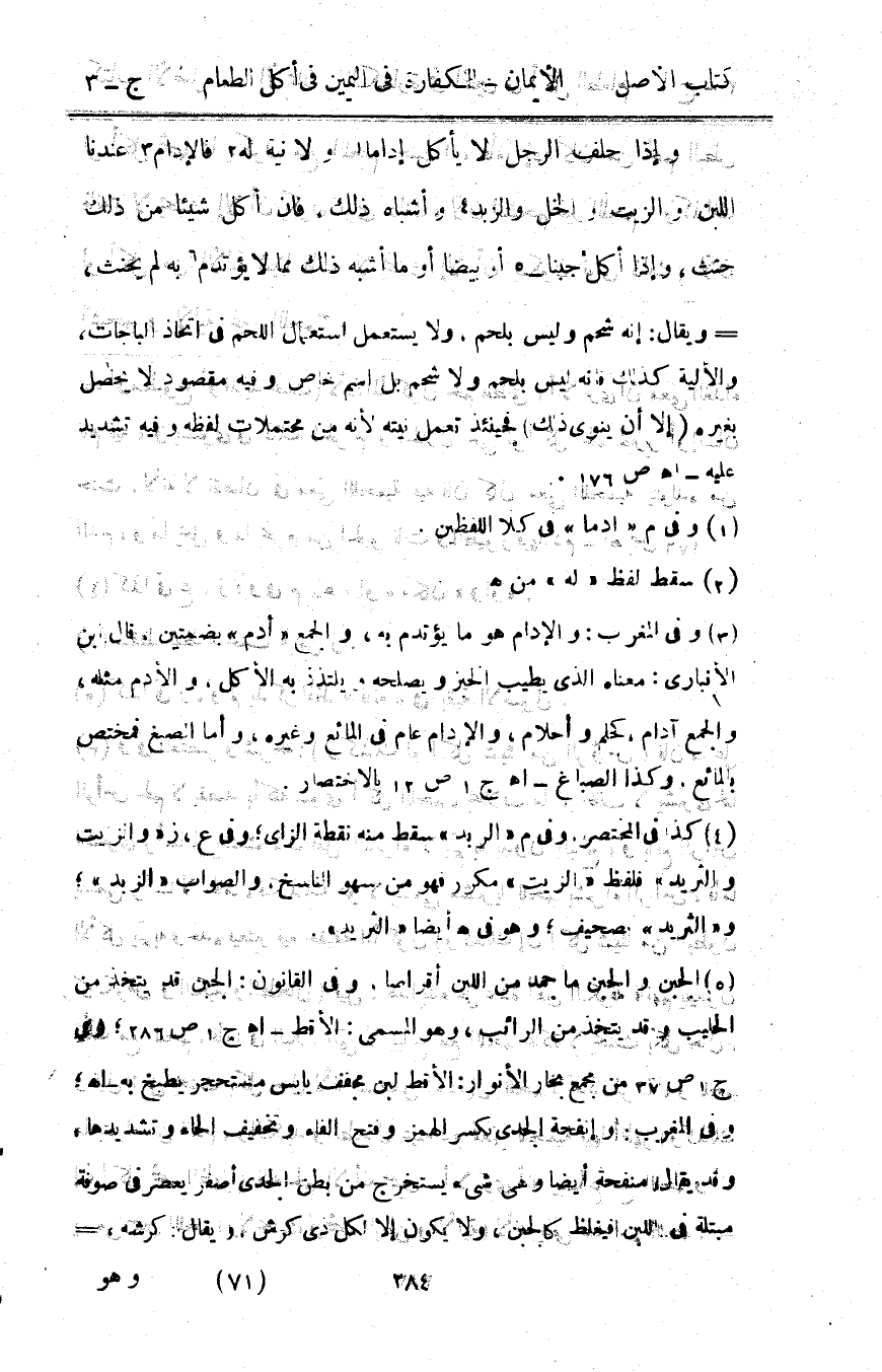 وَإِذا حلف الرجل لَا يَأْكُل إدَامًا وَلَا نِيَّة لَهُ فالإدام عندنَا اللَّبن وَالزَّيْت والخل والزبد وَأَشْبَاه ذَلِك فان أكل شَيْئا من ذَلِك حنث وَإِذا أكل جبنا أَو بيضًا أَو مَا أشبه ذَلِك مِمَّا لَا يؤتدم بِهِ لم يَحْنَث