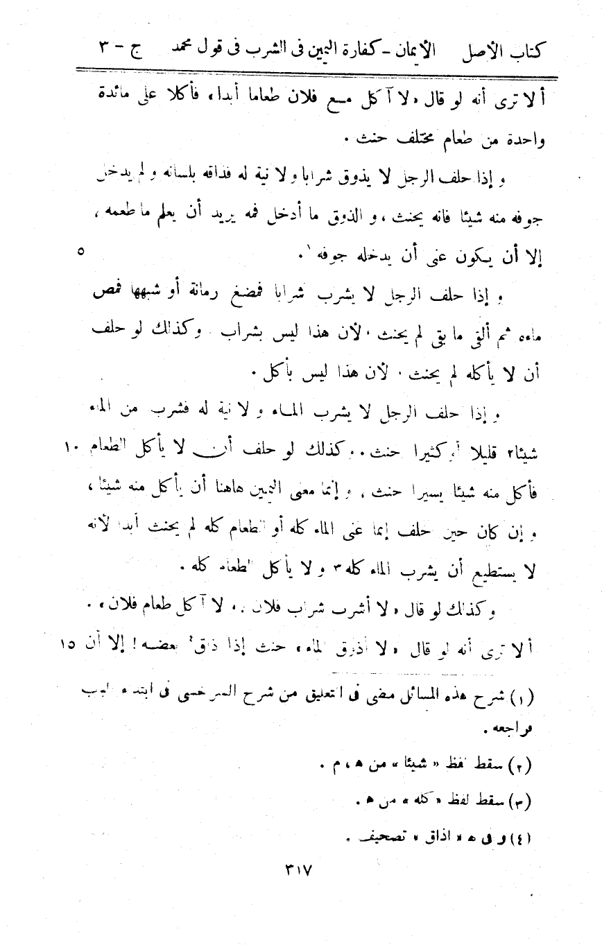 وَإِذا حلف الرجل لَا يشرب المَاء وَلَا نِيَّة لَهُ فَشرب من المَاء شَيْئا قَلِيلا أَو كثيرا حنث وَكَذَلِكَ لَو حلف أَن لَا يَأْكُل الطَّعَام فَأكل مِنْهُ شَيْئا يَسِيرا حنث وَإِنَّمَا معنى الْيَمين هَا هُنَا أَن يَأْكُل مِنْهُ شَيْئا وَإِن كَانَ حِين حلف إِنَّمَا عَنى المَاء كُله أَو الطَّعَام كُله لم يَحْنَث أبدا لِأَنَّهُ لَا يَسْتَطِيع أَن يشرب المَاء كُله وَلَا يَأْكُل الطَّعَام كُله