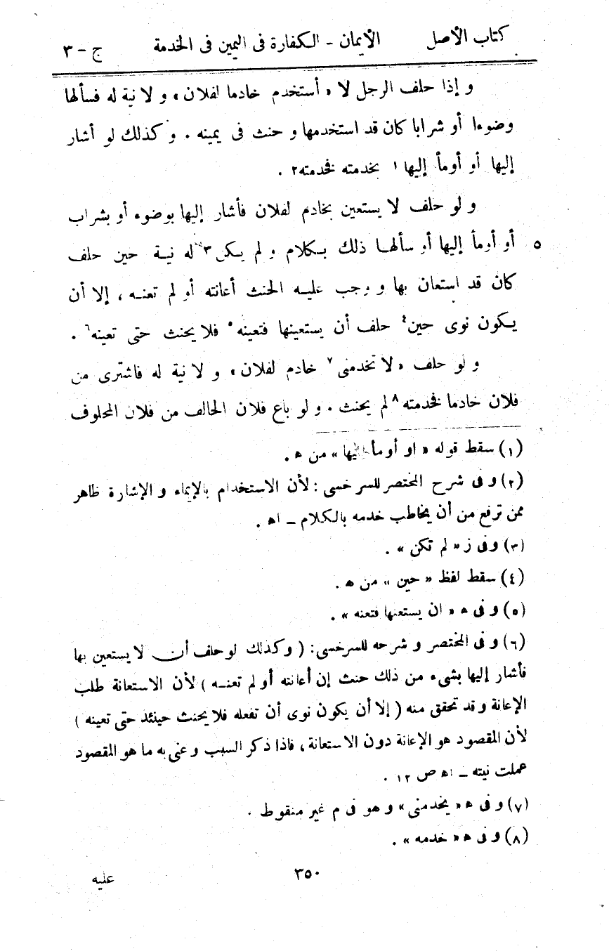 وَإِذا حلف الرجل لَا أستخدم خَادِمًا لفُلَان وَلَا نِيَّة لَهُ فَسَأَلَهَا وضُوءًا أَو شرابًا كَانَ قد استخدمها وَحنث فِي يَمِينه وَكَذَلِكَ لَو أَشَارَ إِلَيْهَا أَو أَوْمَأ إِلَيْهَا بخدمته فخدمته