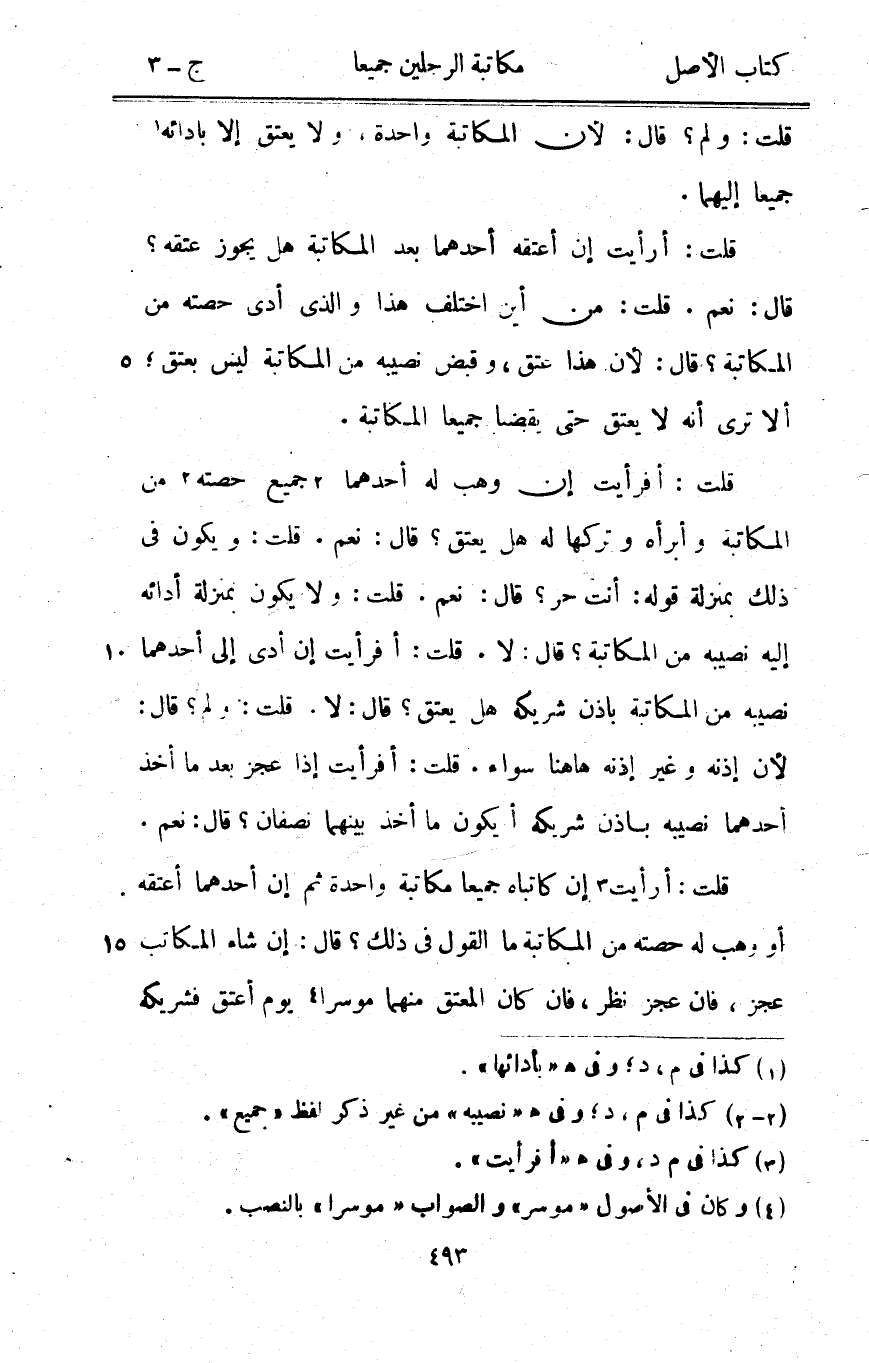 قلت أَفَرَأَيْت إِن وهب لَهُ أَحدهمَا جَمِيع حِصَّته من الْمُكَاتبَة وأبرأه وَتركهَا لَهُ هَل يعْتق قَالَ نعم قلت وَيكون فِي ذَلِك بِمَنْزِلَة قَوْله أَنْت حر قَالَ نعم قلت وَلَا يكون بِمَنْزِلَة أَدَائِهِ إِلَيْهِ نصِيبه من الْمُكَاتبَة قَالَ لَا قلت أَفَرَأَيْت إِن أدّى إِلَى أَحدهمَا نصِيبه من الْمُكَاتبَة بِإِذن شَرِيكه هَل يعْتق قَالَ لَا قلت وَلم قَالَ لِأَن إِذْنه وَغير إِذْنه هَاهُنَا سَوَاء قلت أَفَرَأَيْت إِذا عجز بعد مَا أَخذ أَحدهمَا نصِيبه بِإِذن شَرِيكه أَيكُون مَا أَخذ بَينهمَا نِصْفَانِ قَالَ نعم