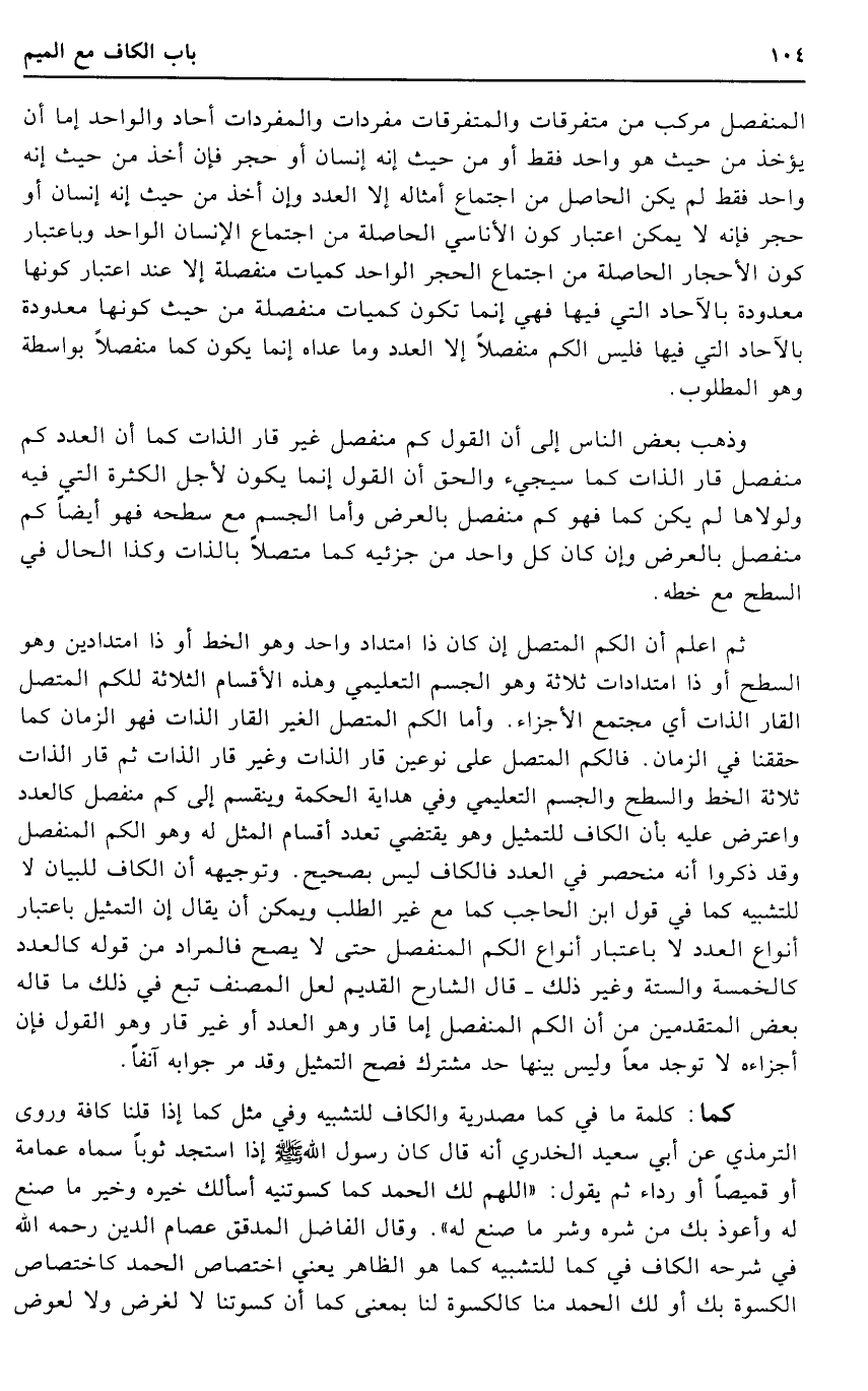 ثمَّ اعْلَم أَن الْكمّ الْمُتَّصِل إِن كَانَ ذَا امتداد وَاحِد وَهُوَ الْخط أَو ذَا امتدادين وَهُوَ السَّطْح أَو ذَا امتدادات ثَلَاثَة وَهُوَ الْجِسْم التعليمي وَهَذِه الْأَقْسَام الثَّلَاثَة للكم الْمُتَّصِل القار الذَّات أَي مُجْتَمع الاجزاء. وَأما الْكمّ الْمُتَّصِل الْغَيْر القار الذَّات فَهُوَ الزَّمَان كَمَا حققنا فِي الزَّمَان. فالكم الْمُتَّصِل على نَوْعَيْنِ قار الذَّات وَغير قار الذَّات ثمَّ قار الذَّات ثَلَاثَة الْخط والسطح والجسم التعلمي وَفِي هِدَايَة الْحِكْمَة وينقسم إِلَى كم مُنْفَصِل كالعدد وَاعْترض عَلَيْهِ بِأَن الْكَاف للتمثيل وَهُوَ يَقْتَضِي تعدد أَقسَام الْمثل لَهُ وَهُوَ الْكمّ الْمُنْفَصِل وَقد ذكرُوا أَنه منحصر فِي الْعدَد فالكاف لَيْسَ بِصَحِيح. وتوجيهه أَن الْكَاف للْبَيَان لَا للتشبيه كَمَا فِي قَول ابْن الْحَاجِب كَمَا مَعَ غير الطّلب وَيُمكن أَن يُقَال إِن التَّمْثِيل بِاعْتِبَار أَنْوَاع الْعدَد لَا بِاعْتِبَار أَنْوَاع الْكمّ الْمُنْفَصِل حَتَّى لَا يَصح فَالْمُرَاد من قَوْله كالعدد كالخمسة والستة وَغير ذَلِك - قَالَ الشَّارِح الْقَدِيم لَعَلَّ المُصَنّف تبع فِي ذَلِك مَا قَالَه بعض الْمُتَقَدِّمين من أَن الْكمّ الْمُنْفَصِل إِمَّا قار وَهُوَ الْعدَد أَو غير قار وَهُوَ القَوْل فَإِن أجزاءه لَا تُوجد مَعًا وَلَيْسَ بَينهَا حد مُشْتَرك فصح التَّمْثِيل وَقد مر جَوَابه آنِفا.