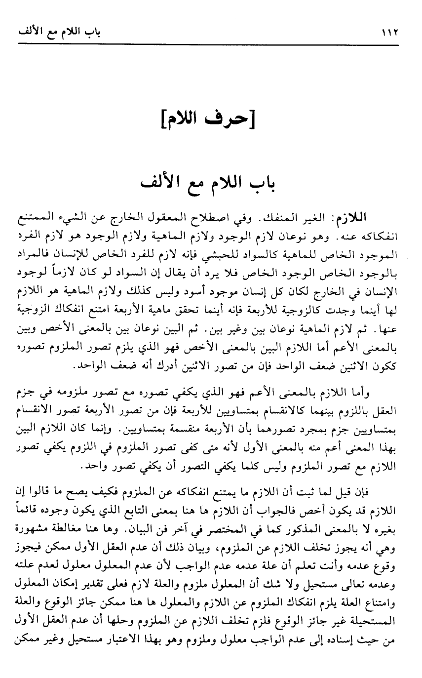 اللَّازِم: الْغَيْر المنفك. وَفِي اصْطِلَاح الْمَعْقُول الْخَارِج عَن الشَّيْء الْمُمْتَنع انفكاكه عَنهُ. وَهُوَ نَوْعَانِ لَازم الْوُجُود ولازم الْمَاهِيّة ولازم الْوُجُود هُوَ لَازم الْفَرد الْمَوْجُود الْخَاص للماهية كالسواد للحبشي فَإِنَّهُ لَازم للفرد الْخَاص للْإنْسَان فَالْمُرَاد بالوجود الْخَاص الْوُجُود الْخَاص فَلَا يرد أَن يُقَال إِن السوَاد لَو كَانَ لَازِما لوُجُود الْإِنْسَان فِي الْخَارِج لَكَانَ كل إِنْسَان مَوْجُود أسود وَلَيْسَ كَذَلِك ولازم الْمَاهِيّة هُوَ اللَّازِم لَهَا أَيْنَمَا وجدت كالزوجية للأربعة فَإِنَّهُ أَيْنَمَا تحقق مَاهِيَّة الْأَرْبَعَة امْتنع انفكاك الزَّوْجِيَّة عَنْهَا. ثمَّ لَازم الْمَاهِيّة نَوْعَانِ بَين وَغير بَين. ثمَّ الْبَين نَوْعَانِ بَين بِالْمَعْنَى الْأَخَص وَبَين بِالْمَعْنَى الْأَعَمّ أما اللَّازِم الْبَين بِالْمَعْنَى الْأَخَص فَهُوَ الَّذِي يلْزم تصور الْمَلْزُوم تصَوره ككون الِاثْنَيْنِ ضعف الْوَاحِد فَإِنَّهُ من تصور الِاثْنَيْنِ أدْرك أَنه ضعف الْوَاحِد.