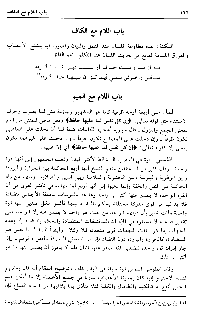 اللَّمْس: قُوَّة فِي العصب المخالط لأكْثر الْبدن وَذهب الْجُمْهُور إِلَى أَنَّهَا قُوَّة وَاحِدَة. وَقَالَ كثير من الْمُحَقِّقين مِنْهُم الشَّيْخ أَنَّهَا أَربع الحاكمة بَين الْحَرَارَة والبرودة وَبَين الرُّطُوبَة واليبوسة وَبَين الخشونة والملاسة وَبَين اللين والصلابة. وَمِنْهُم من زَاد الحاكمة بَين الثّقل والخفة وَإِنَّمَا ذَهَبُوا إِلَى أَنَّهَا أَربع لما مهدوه فِي تَكْثِير القوى من أَن الْقُوَّة الْوَاحِدَة لَا يصدر عَنْهَا أَكثر من وَاحِد وَهَا هُنَا ملموسات مُخْتَلفَة الْأَجْنَاس متضادة فَلَا بُد لَهَا من قوى مدركة مُخْتَلفَة يحكم بالتضاد بَينهَا فأثبتوا لكل ضدين مِنْهَا قُوَّة وَاحِدَة وَأَنت خَبِير بِأَن قَوْلهم الْوَاحِد من حَيْثُ هُوَ وَاحِد لَا يصدر عَنهُ إِلَّا الْوَاحِد على تَقْدِير صِحَّته لَا يسْتَلْزم فِي الْإِدْرَاك المختلفات المتضادة وَالْحكم بالتضاد إِلَّا بِعَدَد الْجِهَات إِمَّا كَون تِلْكَ الْجِهَات قوى مُتعَدِّدَة فَلَا وكلا. وَأَيْضًا الْمدْرك بالحس هُوَ المتضادان كالحرارة والبرودة دون التضاد فَإِنَّهُ من الْمعَانِي المدركة بِالْعقلِ وَالوهم - وَإِذا جَازَ إِدْرَاك قُوَّة وَاحِدَة لضدين فقد صدر عَنْهَا اثْنَان فَلم لَا يجوز أَن يصدر عَنْهَا مَا هُوَ أَكثر من ذَلِك.