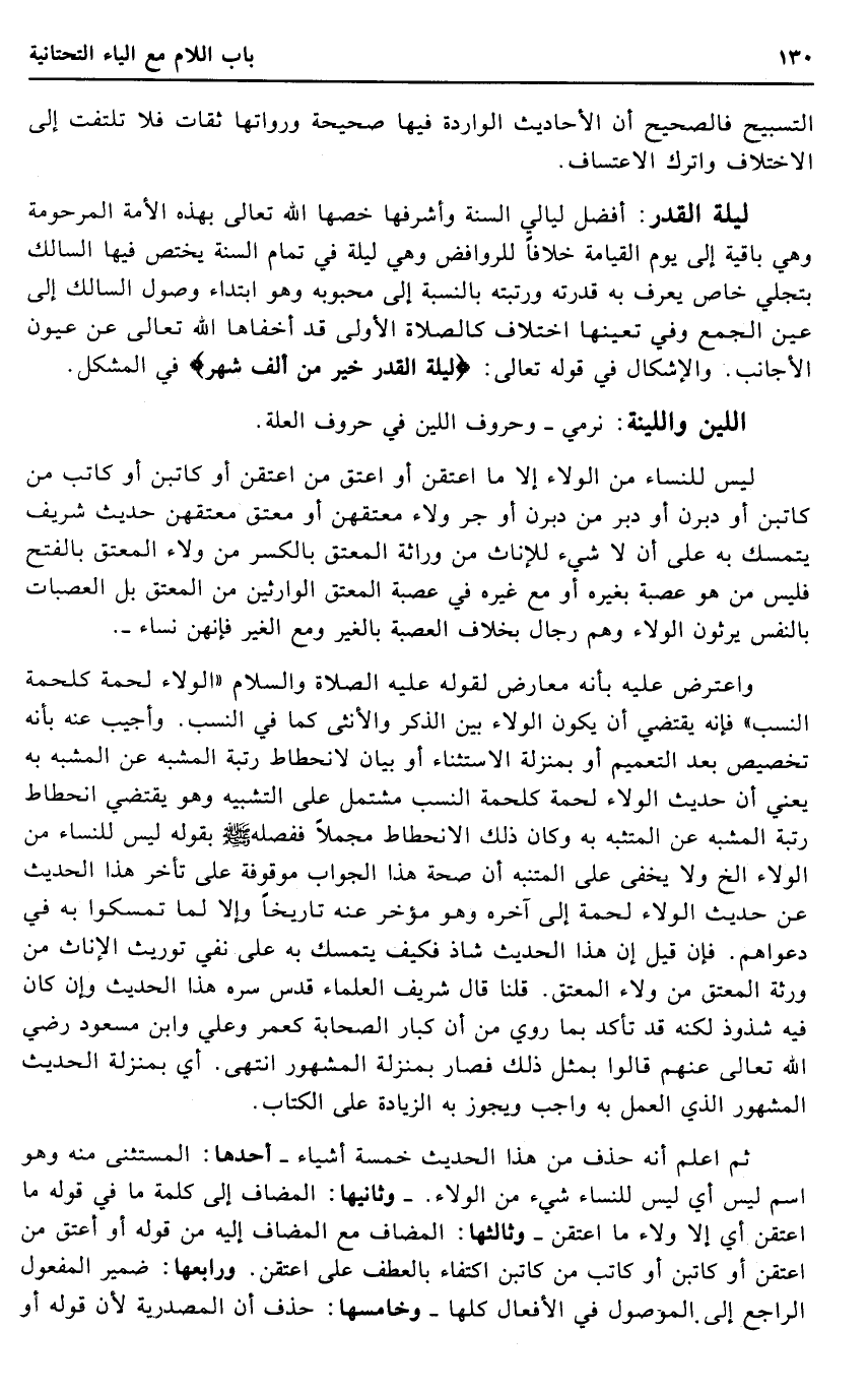 وَاعْترض عَلَيْهِ بِأَنَّهُ معَارض لقَوْله عَلَيْهِ الصَّلَاة وَالسَّلَام " الْوَلَاء لحْمَة كلحمة النّسَب " فَإِنَّهُ يَقْتَضِي أَن يكون الْوَلَاء بَين الذّكر وَالْأُنْثَى كَمَا فِي النّسَب. وَأجِيب عَنهُ بِأَنَّهُ تَخْصِيص بعد التَّعْمِيم أَو بِمَنْزِلَة الِاسْتِثْنَاء أَو بَيَان لانحطاط رُتْبَة الْمُشبه عَن الْمُشبه بِهِ يَعْنِي أَن حَدِيث الْوَلَاء لحْمَة كلحمة النّسَب مُشْتَمل على التَّشْبِيه وَهُوَ يَقْتَضِي انحطاط رُتْبَة الْمُشبه عَن المتشبه بِهِ وَكَانَ ذَلِك الانحطاط مُجملا ففصله - صَلَّى اللَّهُ عَلَيْهِ وَسَلَّم َ - بقوله لَيْسَ للنِّسَاء من الْوَلَاء الخ وَلَا يخفى على المتنبه أَن صِحَة هَذَا الْجَواب مَوْقُوفَة على تَأَخّر هَذَا الحَدِيث عَن حَدِيث الْوَلَاء لحْمَة إِلَى آخِره وَهُوَ مُؤخر عَنهُ تَارِيخا وَإِلَّا لما تمسكوا بِهِ فِي دَعوَاهُم. فَإِن قيل إِن هَذَا الحَدِيث شَاذ فَكيف يتَمَسَّك بِهِ على نفي تَوْرِيث الْإِنَاث من وَرَثَة الْمُعْتق من وَلَاء الْمُعْتق. قُلْنَا قَالَ شرِيف الْعلمَاء قدس سره هَذَا الحَدِيث وَإِن كَانَ فِيهِ شذوذ لكنه قد تَأَكد بِمَا رُوِيَ من أَن كبار الصَّحَابَة كعمر وَعلي وَابْن مَسْعُود رَضِي الله تَعَالَى عَنْهُم قَالُوا بِمثل ذَلِك فَصَارَ بِمَنْزِلَة الْمَشْهُور انْتهى. أَي بِمَنْزِلَة الحَدِيث الْمَشْهُور الَّذِي الْعَمَل بِهِ وَاجِب وَيجوز بِهِ الزِّيَادَة على الْكتاب.