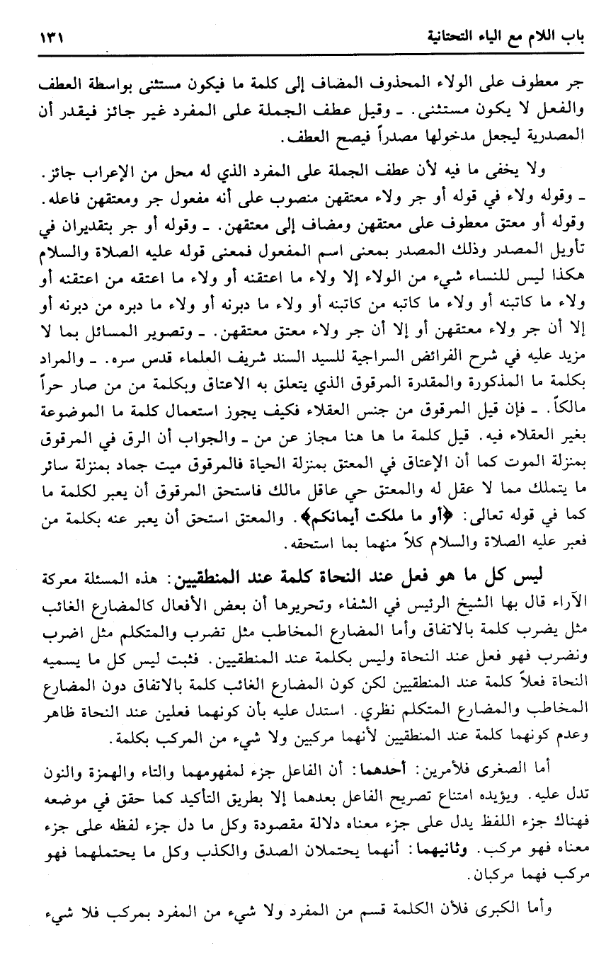 لَيْسَ كل مَا هُوَ فعل عِنْد النُّحَاة كلمة عِنْد المنطقيين: هَذِه المسئلة معركة الآراء قَالَ بهَا الشَّيْخ الرئيس فِي الشِّفَاء وتحريرها أَن بعض الْأَفْعَال كالمضارع الْغَائِب مثل يضْرب كلمة بالِاتِّفَاقِ وَأما الْمُضَارع الْمُخَاطب مثل تضرب والمتكلم مثل اضْرِب ونضرب فَهُوَ فعل عِنْد النُّحَاة وَلَيْسَ بِكَلِمَة عِنْد المنطقيين. فَثَبت لَيْسَ كل مَا يُسَمِّيه النُّحَاة فعلا كلمة عِنْد المنطقيين لَكِن كَون الْمُضَارع الْغَائِب كلمة بالِاتِّفَاقِ دون الْمُضَارع الْمُخَاطب والمضارع الْمُتَكَلّم نَظَرِي. اسْتدلَّ عَلَيْهِ بِأَن كَونهمَا فعلين عِنْد النُّحَاة ظَاهر وَعدم كَونهمَا كلمة عِنْد المنطقيين لِأَنَّهُمَا مركبين وَلَا شَيْء من الْمركب بِكَلِمَة.