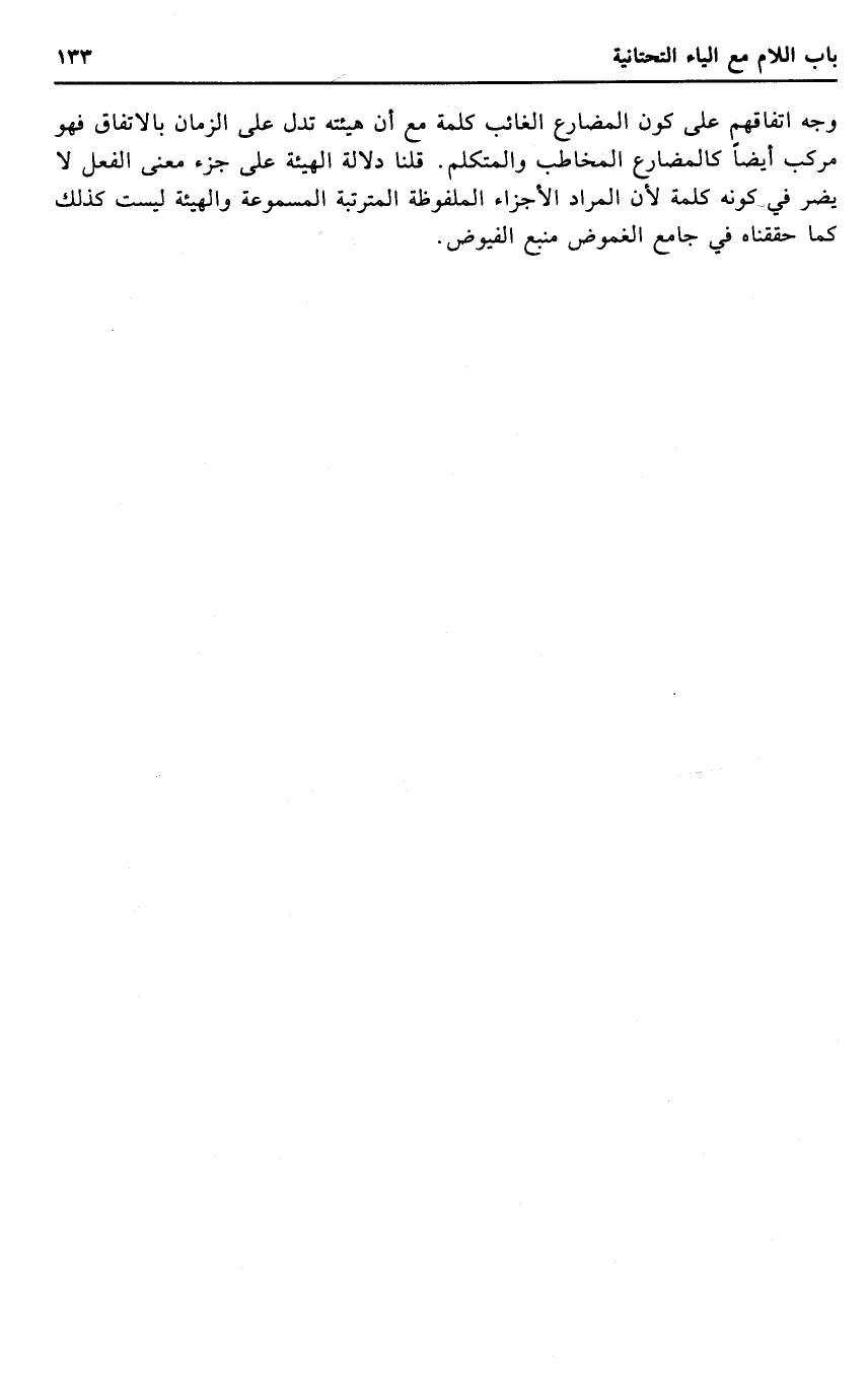 وَجه اتِّفَاقهم على كَون الْمُضَارع الْغَائِب كلمة مَعَ أَن هَيئته تدل على الزَّمَان بالِاتِّفَاقِ فَهُوَ مركب أَيْضا كالمضارع الْمُخَاطب والمتكلم. قُلْنَا دلَالَة الْهَيْئَة على جُزْء معنى الْفِعْل لَا يضر فِي كَونه كلمة لِأَن المُرَاد الْأَجْزَاء الملفوظة المترتبة المسموعة والهيئة لَيست كَذَلِك كَمَا حققناه فِي جَامع الغموض منبع الفيوض.