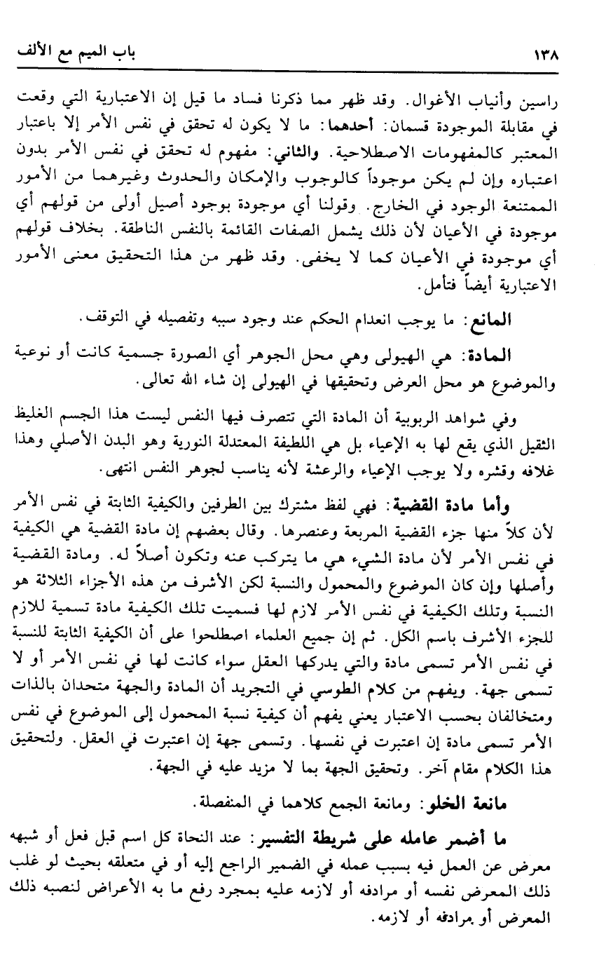 وَأما مَادَّة الْقَضِيَّة: فَهِيَ لفظ مُشْتَرك بَين الطَّرفَيْنِ والكيفية الثَّابِتَة فِي نفس الْأَمر لِأَن كلا مِنْهَا جُزْء الْقَضِيَّة المربعة وعنصرها. وَقَالَ بَعضهم إِن مَادَّة الْقَضِيَّة هِيَ الْكَيْفِيَّة فِي نفس الْأَمر لِأَن مَادَّة الشَّيْء هِيَ مَا يتركب عَنهُ وَتَكون أصلا لَهُ. ومادة الْقَضِيَّة وَأَصلهَا وَإِن كَانَ الْمَوْضُوع والمحمول وَالنِّسْبَة لَكِن الْأَشْرَف من هَذِه الْأَجْزَاء الثَّلَاثَة هُوَ النِّسْبَة وَتلك الْكَيْفِيَّة فِي نفس الْأَمر لَازم لَهَا فسميت تِلْكَ الْكَيْفِيَّة مَادَّة تَسْمِيَة للازم للجزء الْأَشْرَف باسم الْكل. ثمَّ إِن جَمِيع الْعلمَاء اصْطَلحُوا على أَن الْكَيْفِيَّة الثَّابِتَة للنسبة فِي نفس الْأَمر تسمى مَادَّة وَالَّتِي يُدْرِكهَا الْعقل سَوَاء كَانَت لَهَا فِي نفس الْأَمر أَو لَا تسمى جِهَة. وَيفهم من كَلَام الطوسي فِي التَّجْرِيد أَن الْمَادَّة والجهة متحدان بِالذَّاتِ ومتخالفان بِحَسب الِاعْتِبَار يَعْنِي يفهم أَن كَيْفيَّة نِسْبَة الْمَحْمُول إِلَى الْمَوْضُوع فِي نفس الْأَمر تسمى مَادَّة إِن اعْتبرت فِي نَفسهَا. وَتسَمى جِهَة إِن اعْتبرت فِي الْعقل. ولتحقيق هَذَا الْكَلَام مقَام آخر. وَتَحْقِيق الْجِهَة بِمَا لَا مزِيد عَلَيْهِ فِي الْجِهَة.