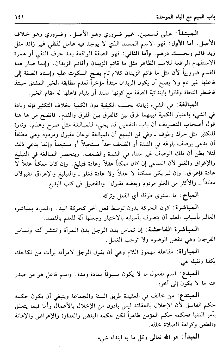 الْمُبْتَدَأ: على قسمَيْنِ. غير ضَرُورِيّ وَهُوَ الأَصْل. وضروري وَهُوَ خلاف الأَصْل. أما الأول: فَهُوَ الِاسْم الْمسند الَّذِي لَا يُوجد فِيهِ عَامل لَفْظِي غير زَائِد مثل زيد قَائِم وَبِحَسْبِكَ دِرْهَم. وَأما الثَّانِي: فَهُوَ الصّفة الْوَاقِعَة بعد حرف النَّفْي أَو همزَة الِاسْتِفْهَام الرافعة للاسم الظَّاهِر مثل مَا قَائِم الزيدان وأقائم الزيدان. وَإِنَّمَا صَار هَذَا الْقسم ضَرُورِيًّا لِأَن مثل مَا قَائِم الزيدان كَلَام تَامّ يَصح السُّكُوت عَلَيْهِ وَإسْنَاد الصّفة إِلَى فاعلها غير تَامّ وَلَا يَصح أَن يكون الزيدان مُبْتَدأ مُؤَخرا لعدم مُطَابقَة الْخَبَر الْمُشْتَقّ حِينَئِذٍ فاضطر النُّحَاة وَقَالُوا بابتدائية الصّفة مَعَ كَونهَا مُسْند أَو بِقِيَام فاعلها لَهُ مقَام الْخَبَر.