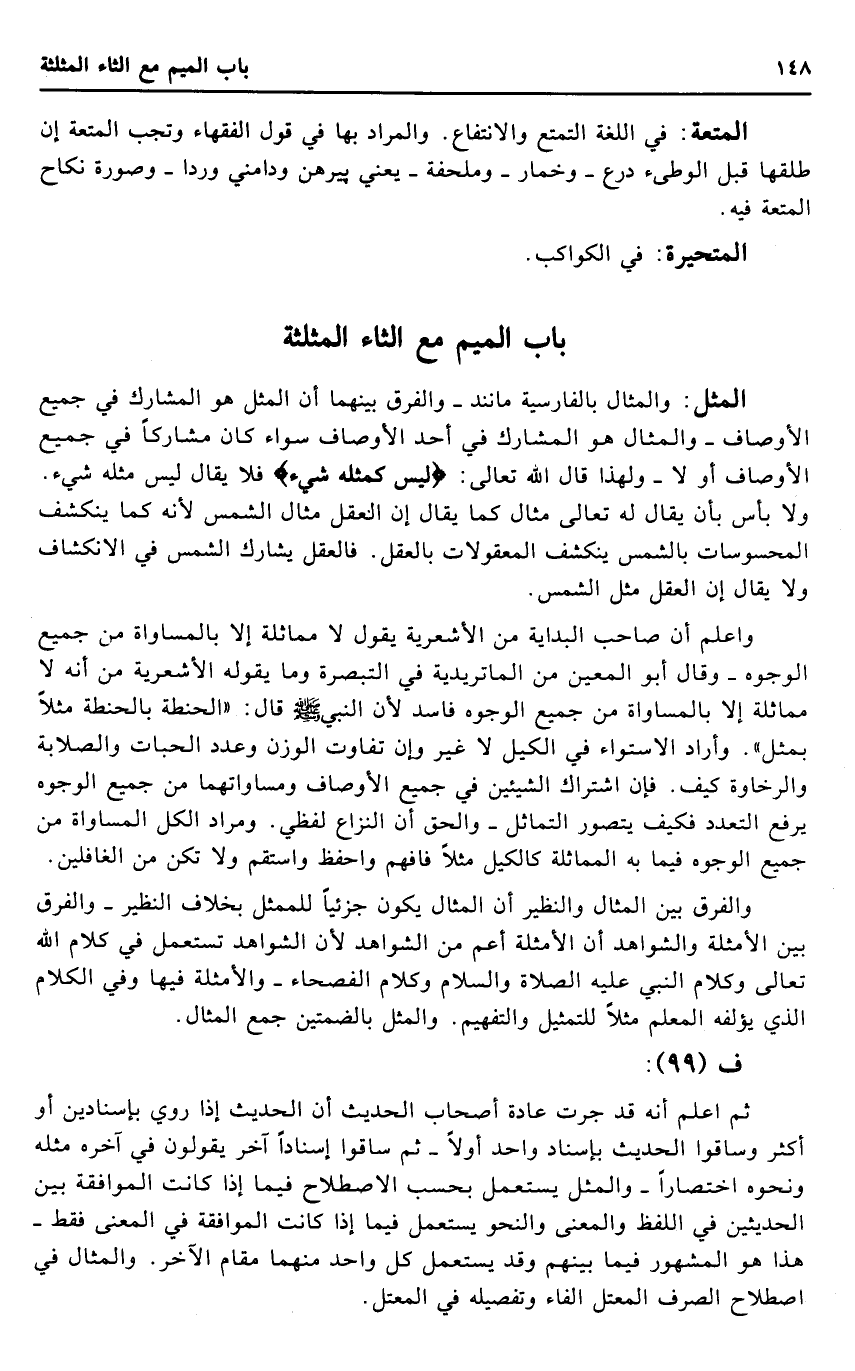 الْمثل: والمثال بِالْفَارِسِيَّةِ مانند - وَالْفرق بَينهمَا أَن الْمثل هُوَ المشارك فِي جَمِيع الْأَوْصَاف - والمثال هُوَ المشارك فِي أحد الْأَوْصَاف سَوَاء كَانَ مشاركا فِي جَمِيع الْأَوْصَاف أَو لَا - وَلِهَذَا قَالَ الله تَعَالَى: {لَيْسَ كمثله شَيْء} فَلَا يُقَال لَيْسَ مثله شَيْء. وَلَا بَأْس بِأَن يُقَال لَهُ تَعَالَى مِثَال كَمَا يُقَال إِن الْعقل مِثَال الشَّمْس لِأَنَّهُ كَمَا ينْكَشف المحسوسات بالشمس ينْكَشف المعقولات بِالْعقلِ. فالعقل يُشَارك الشَّمْس فِي الانكشاف وَلَا يُقَال إِن الْعقل مثل الشَّمْس.