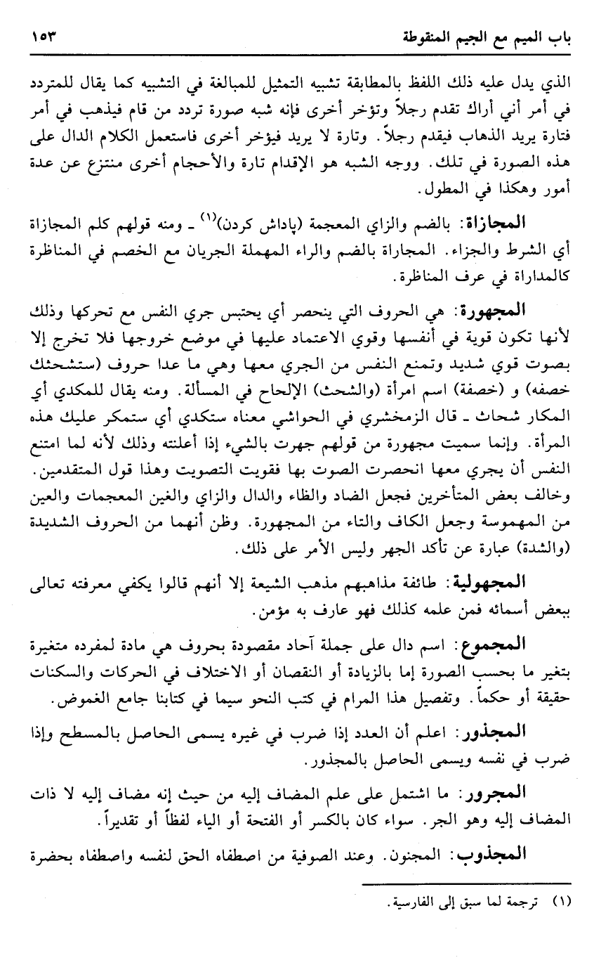 المجهورة: هِيَ الْحُرُوف الَّتِي ينْحَصر أَي يحتبس جري النَّفس مَعَ تحركها وَذَلِكَ لِأَنَّهَا تكون قَوِيَّة فِي أَنْفسهَا وَقَوي الِاعْتِمَاد عَلَيْهَا فِي مَوضِع خُرُوجهَا فَلَا تخرج إِلَّا بِصَوْت قوي شَدِيد وتمنع النَّفس من الجري مَعهَا وَهِي مَا عدا حُرُوف (ستشحثك خصفه) و (خصفة) اسْم امْرَأَة (والشحث) الإلحاح فِي الْمَسْأَلَة. وَمِنْه يُقَال للمكدي أَي المكار شحاث - قَالَ الزَّمَخْشَرِيّ فِي الْحَوَاشِي مَعْنَاهُ ستكدي أَي ستمكر عَلَيْك هَذِه الْمَرْأَة. وَإِنَّمَا سميت مجهورة من قَوْلهم جهرت بالشَّيْء إِذا أعلنته وَذَلِكَ لِأَنَّهُ لما امْتنع النَّفس أَن يجْرِي مَعهَا انحصرت الصَّوْت بهَا فَقَوِيت التصويت وَهَذَا قَول الْمُتَقَدِّمين. وَخَالف بعض الْمُتَأَخِّرين فَجعل الضَّاد والظاء وَالدَّال وَالزَّاي والغين المعجمات وَالْعين من المهموسة وَجعل الْكَاف وَالتَّاء من المجهورة. وَظن أَنَّهُمَا من الْحُرُوف الشَّدِيدَة (والشدة) عبارَة عَن تَأَكد الْجَهْر وَلَيْسَ الْأَمر على ذَلِك.