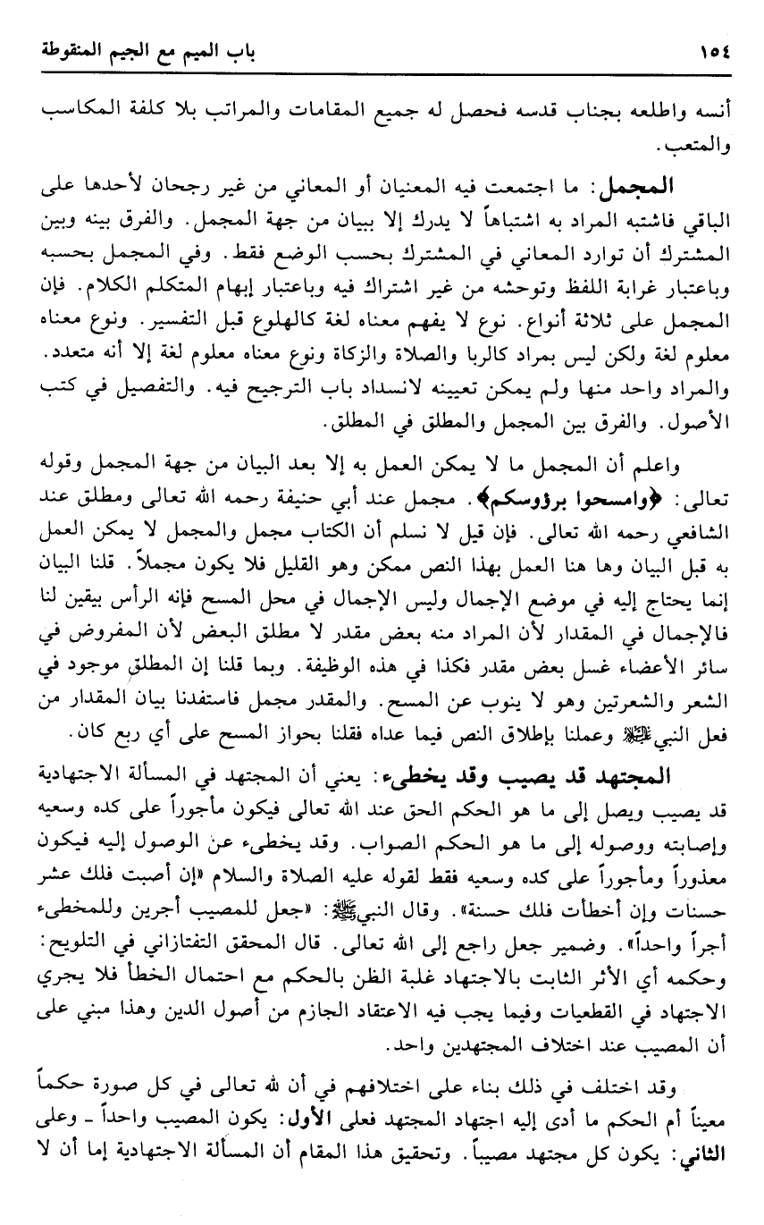 وَاعْلَم أَن الْمُجْمل مَا لَا يُمكن الْعَمَل بِهِ إِلَّا بعد الْبَيَان من جِهَة الْمُجْمل وَقَوله تَعَالَى: {وامسحوا برؤوسكم} . مُجمل عِنْد أبي حنيفَة رَحمَه الله تَعَالَى وَمُطلق عِنْد الشَّافِعِي رَحمَه الله تَعَالَى. فَإِن قيل لَا نسلم أَن الْكتاب مُجمل والمجمل لَا يُمكن الْعَمَل بِهِ قبل الْبَيَان وَهَا هُنَا الْعَمَل بِهَذَا النَّص مُمكن وَهُوَ الْقَلِيل فَلَا يكون مُجملا. قُلْنَا الْبَيَان إِنَّمَا يحْتَاج إِلَيْهِ فِي مَوضِع الْإِجْمَال وَلَيْسَ الْإِجْمَال فِي مَحل الْمسْح فَإِنَّهُ الرَّأْس بِيَقِين لنا فالإجمال فِي الْمِقْدَار لِأَن المُرَاد مِنْهُ بعض مُقَدّر لَا مُطلق الْبَعْض لِأَن الْمَفْرُوض فِي سَائِر الْأَعْضَاء غسل بعض مُقَدّر فَكَذَا فِي هَذِه الْوَظِيفَة. وَبِمَا قُلْنَا إِن الْمُطلق مَوْجُود فِي الشّعْر والشعرتين وَهُوَ لَا يَنُوب عَن الْمسْح. والمقدر مُجمل فاستفدنا بَيَان الْمِقْدَار من فعل النَّبِي عَلَيْهِ السَّلَام وعملنا بِإِطْلَاق النَّص فِيمَا عداهُ فَقُلْنَا بِجَوَاز الْمسْح على أَي ربع كَانَ.