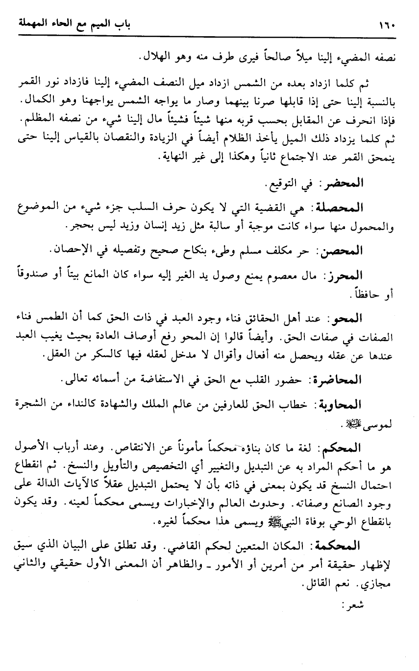 ثمَّ كلما ازْدَادَ بعده من الشَّمْس ازْدَادَ ميل النّصْف المضيء إِلَيْنَا فازداد نور الْقَمَر بِالنِّسْبَةِ إِلَيْنَا حَتَّى إِذا قابلها صرنا بَينهمَا وَصَارَ مَا يواجه الشَّمْس يواجهنا وَهُوَ الْكَمَال. فَإِذا انحرف عَن الْمُقَابل بِحَسب قربه مِنْهَا شَيْئا فَشَيْئًا مَال إِلَيْنَا شَيْء من نصفه المظلم. ثمَّ كلما يزْدَاد ذَلِك الْميل يَأْخُذ الظلام أَيْضا فِي الزِّيَادَة وَالنُّقْصَان بِالْقِيَاسِ إِلَيْنَا حَتَّى ينمحق الْقَمَر عِنْد الِاجْتِمَاع ثَانِيًا وَهَكَذَا إِلَى غير النِّهَايَة.