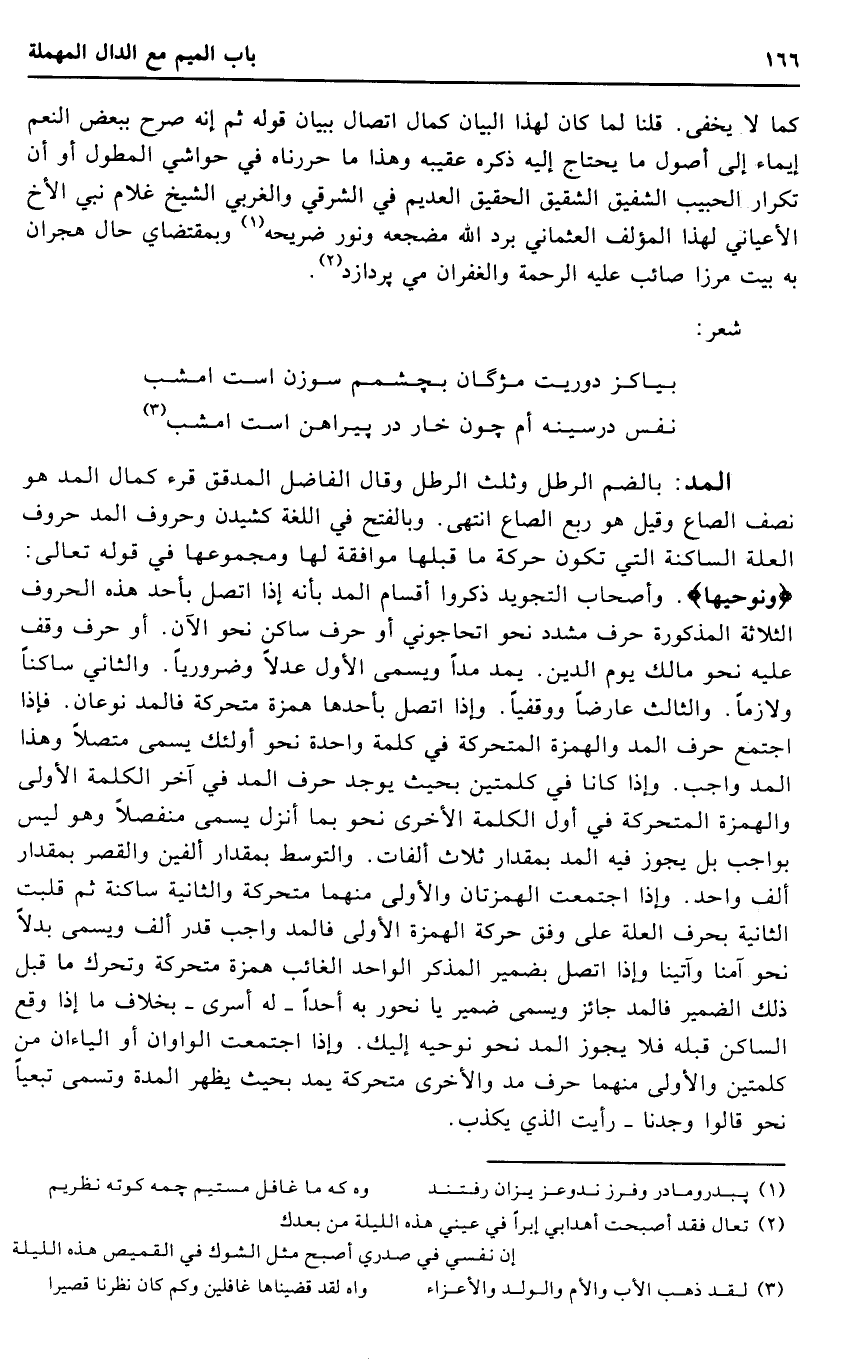 الْمَدّ: بِالضَّمِّ الرطل وَثلث الرطل وَقَالَ الْفَاضِل المدقق قرء كَمَال الْمَدّ هُوَ نصف الصَّاع وَقيل هُوَ ربع الصَّاع انْتهى. وبالفتح فِي اللُّغَة كشيدن وحروف الْمَدّ حُرُوف الْعلَّة الساكنة الَّتِي تكون حَرَكَة مَا قبلهَا مُوَافقَة لَهَا ومجموعها فِي قَوْله تَعَالَى: {ونوحيها} . وَأَصْحَاب التجويد ذكرُوا أَقسَام الْمَدّ بِأَنَّهُ إِذا اتَّصل بِأحد هَذِه الْحُرُوف الثَّلَاثَة الْمَذْكُورَة حرف مشدد نَحْو أتحاجوني أَو حرف سَاكن نَحْو الْآن. أَو حرف وقف عَلَيْهِ نَحْو مَالك يَوْم الدّين. يمد مدا وَيُسمى الأول عدلا وضروريا. وَالثَّانِي سَاكِنا ولازما. وَالثَّالِث عارضا ووقفيا. وَإِذا اتَّصل بأحدها همزَة متحركة فالمد نَوْعَانِ. فَإِذا اجْتمع حرف الْمَدّ والهمزة المتحركة فِي كلمة وَاحِدَة نَحْو أُولَئِكَ يُسمى مُتَّصِلا وَهَذَا الْمَدّ وَاجِب. وَإِذا كَانَا فِي كَلِمَتَيْنِ بِحَيْثُ يُوجد حرف الْمَدّ فِي آخر الْكَلِمَة الأولى والهمزة المتحركة فِي أول الْكَلِمَة الْأُخْرَى نَحْو بِمَا أنزل يُسمى مُنْفَصِلا وَهُوَ لَيْسَ بِوَاجِب بل يجوز فِيهِ الْمَدّ بِمِقْدَار ثَلَاث ألفات. والتوسط بِمِقْدَار أَلفَيْنِ وَالْقصر بِمِقْدَار ألف وَاحِد. وَإِذا اجْتمعت الهمزتان وَالْأولَى مِنْهُمَا متحركة وَالثَّانيَِة سَاكِنة ثمَّ قلبت الثَّانِيَة بِحرف الْعلَّة على وفْق حَرَكَة الْهمزَة الأولى فالمد وَاجِب قدر ألف وَيُسمى بَدَلا نَحْو آمنا وآتينا وَإِذا اتَّصل بضمير الْمُذكر الْوَاحِد الْغَائِب همزَة متحركة وتحرك مَا قبل ذَلِك الضَّمِير فالمد جَائِز وَيُسمى ضمير يَا نحور بِهِ أحدا - لَهُ أسرى - بِخِلَاف مَا إِذا وَقع السَّاكِن قبله فَلَا يجوز الْمَدّ نَحْو نوحيه إِلَيْك. وَإِذا اجْتمعت الواوان أَو الياءان من كَلِمَتَيْنِ وَالْأولَى مِنْهُمَا حرف مد وَالْأُخْرَى متحركة يمد بِحَيْثُ يظْهر الْمدَّة وَتسَمى تبعيا نَحْو قَالُوا وجدنَا - رَأَيْت الَّذِي يكذب.