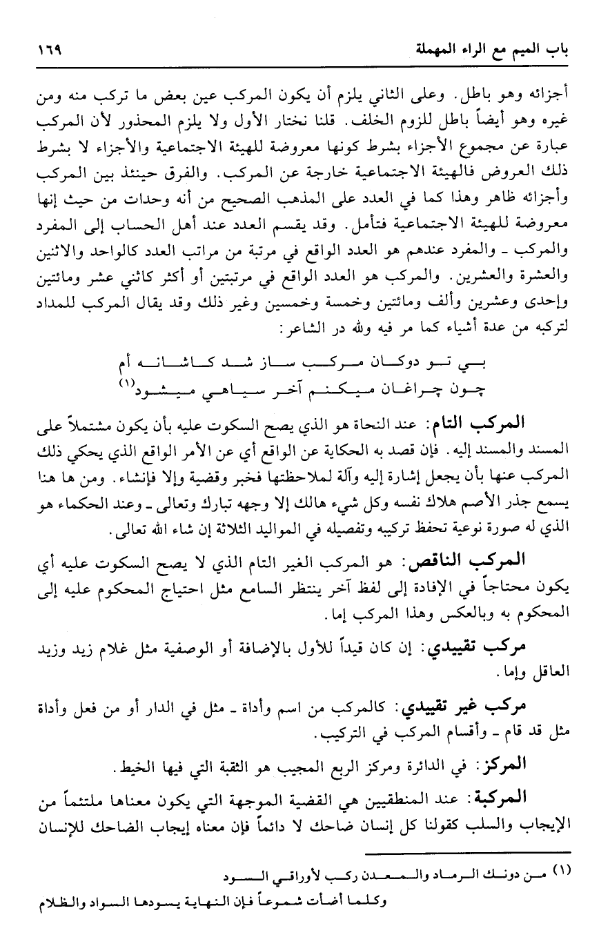 أَجْزَائِهِ وَهُوَ بَاطِل. وعَلى الثَّانِي يلْزم أَن يكون الْمركب عين بعض مَا تركب مِنْهُ وَمن غَيره وَهُوَ أَيْضا بَاطِل للُزُوم الْخلف. قُلْنَا نَخْتَار الأول وَلَا يلْزم الْمَحْذُور لِأَن الْمركب عبارَة عَن مَجْمُوع الْأَجْزَاء بِشَرْط كَونهَا معروضة للهيئة الاجتماعية والأجزاء لَا بِشَرْط ذَلِك الْعرُوض فالهيئة الاجتماعية خَارِجَة عَن الْمركب. وَالْفرق حِينَئِذٍ بَين الْمركب وأجزائه ظَاهر وَهَذَا كَمَا فِي الْعدَد على الْمَذْهَب الصَّحِيح من أَنه وحدات من حَيْثُ إِنَّهَا معروضة للهيئة الاجتماعية فَتَأمل. وَقد يقسم الْعدَد عِنْد أهل الْحساب إِلَى الْمُفْرد والمركب - والمفرد عِنْدهم هُوَ الْعدَد الْوَاقِع فِي مرتبَة من مَرَاتِب الْعدَد كالواحد والاثنين وَالْعشرَة وَالْعِشْرين. والمركب هُوَ الْعدَد الْوَاقِع فِي مرتبتين أَو أَكثر كاثني عشر وَمِائَتَيْنِ وَإِحْدَى وَعشْرين وَألف وَمِائَتَيْنِ وَخَمْسَة وَخمسين وَغير ذَلِك وَقد يُقَال الْمركب للمداد لتركبه من عدَّة أَشْيَاء كَمَا مر فِيهِ وَللَّه در الشَّاعِر: