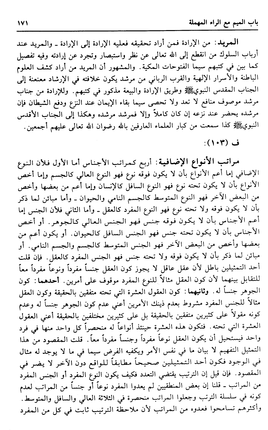 المريد: من الْإِرَادَة فَمن أَرَادَ تَحْقِيقه فَعَلَيهِ الْإِرَادَة إِلَى الْإِرَادَة - والمريد عِنْد أَرْبَاب السلوك من انْقَطع إِلَى الله تَعَالَى عَن نظر واستبصار وتجرد عَن إِرَادَته وَفِيه تَفْصِيل كَمَا بَين فِي كتبهمْ سِيمَا الفتوحات المكية. وَالْمَشْهُور أَن المريد من أَرَادَ كشف الْعُلُوم الْبَاطِنَة والأسرار الإلهية والقرب الرباني من مرشد يكون خِلَافَته فِي الْإِرْشَاد معنعنة إِلَى الجناب الْمُقَدّس النَّبَوِيّ - صَلَّى اللَّهُ عَلَيْهِ وَسَلَّم َ - وَطَرِيق الْإِرَادَة والبيعة مَذْكُور فِي كتبهمْ. وللإرادة من جناب مرشد مَوْصُوف مَنَافِع لَا تعد وَلَا تحصى سِيمَا بَقَاء الْإِيمَان عِنْد النزع وَدفع الشَّيْطَان فَإِن مرشده يحضر عِنْد نَزعه إِن كَانَ كَامِلا وَإِلَّا فمرشد مرشده وَهَكَذَا إِلَى الجناب الأقدس النَّبَوِيّ - صَلَّى اللَّهُ عَلَيْهِ وَسَلَّم َ - كَذَا سَمِعت من كبار الْعلمَاء العارفين بِاللَّه رضوَان الله تَعَالَى عَلَيْهِم أَجْمَعِينَ.