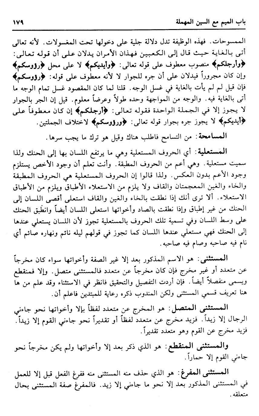 الْمُسْتَثْنى: هُوَ الِاسْم الْمَذْكُور بعد إِلَّا غير الصّفة وَأَخَوَاتهَا سَوَاء كَانَ مخرجا عَن مُتَعَدد أَو غير مخرج فَإِن كَانَ مخرجا عَن مُتَعَدد فالمستثنى مُتَّصِل. وَإِلَّا فمنقطع وَيُسمى مُنْفَصِلا أَيْضا. فَإِن أردْت التَّفْصِيل وَالتَّحْقِيق فَانْظُر فِي الِاسْتِثْنَاء وَقد علم من هَا هُنَا تَعْرِيف قسمي الْمُسْتَثْنى وَلَكِن الْمَنْدُوب ذكره رِعَايَة للمبتدين فَاعْلَم أَن.