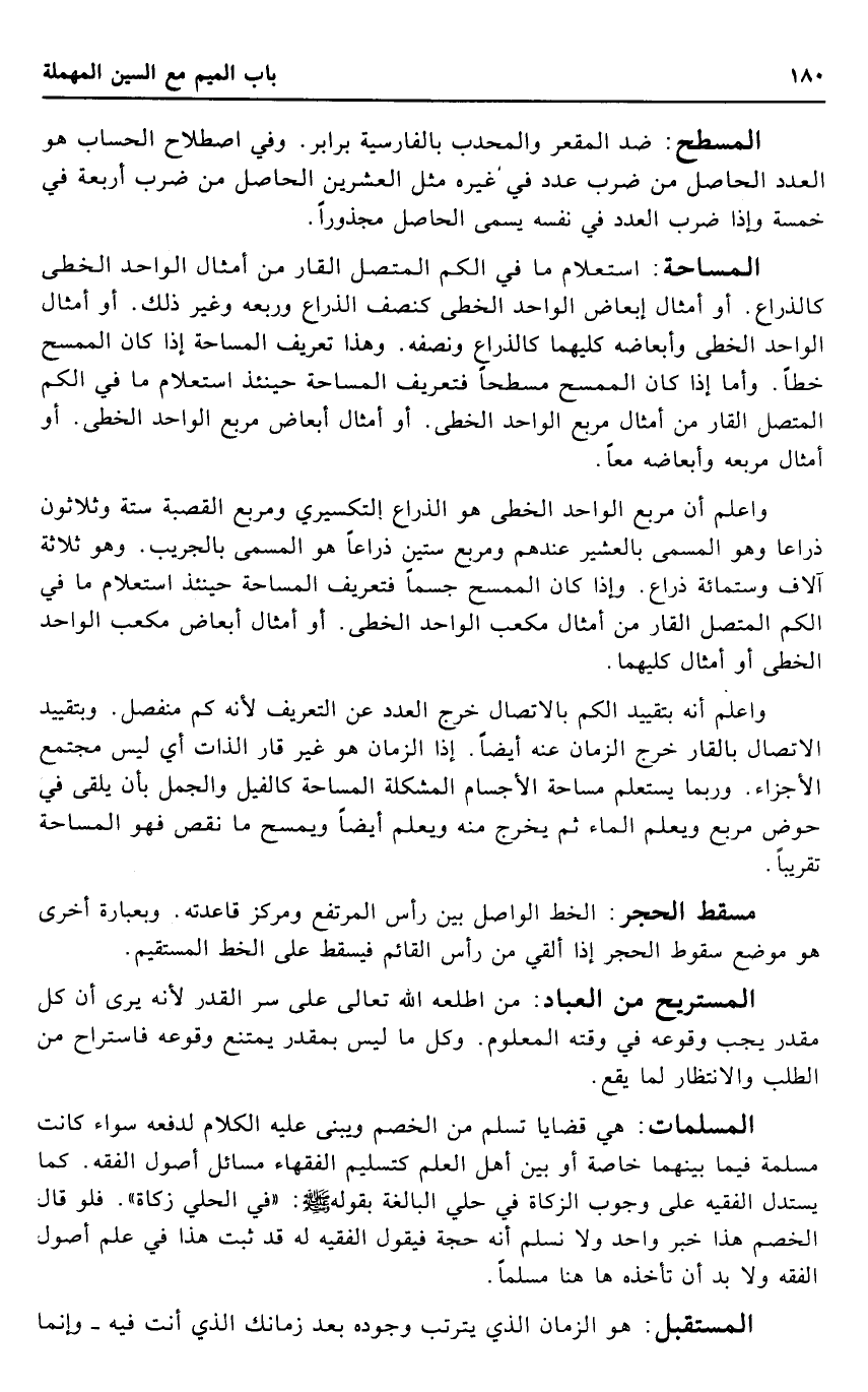 المساحة: استعلام مَا فِي الْكمّ الْمُتَّصِل القار من أَمْثَال الْوَاحِد الخطى كالذراع. أَو أَمْثَال إبعاض الْوَاحِد الخطى كَنِصْف الذِّرَاع وربعه وَغير ذَلِك. أَو أَمْثَال الْوَاحِد الخطى وأبعاضه كليهمَا كالذراع وَنصفه. وَهَذَا تَعْرِيف المساحة إِذا كَانَ الممسح خطا. وَأما إِذا كَانَ الممسح مسطحًا فتعريف المساحة حِينَئِذٍ استعلام مَا فِي الْكمّ الْمُتَّصِل القار من أَمْثَال مربع الْوَاحِد الخطى. أَو أَمْثَال أبعاض مربع الْوَاحِد الخطى. أَو أَمْثَال مربعه وأبعاضه مَعًا.