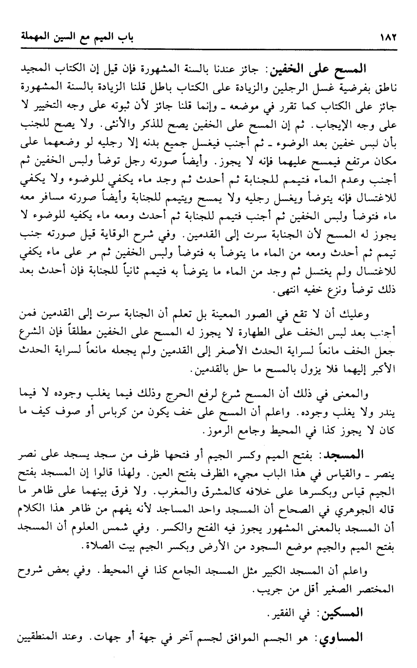 الْمسْح على الْخُفَّيْنِ: جَائِز عندنَا بِالسنةِ الْمَشْهُورَة فَإِن قيل إِن الْكتاب الْمجِيد نَاطِق بفرضية غسل الرجلَيْن وَالزِّيَادَة على الْكتاب بَاطِل قُلْنَا الزِّيَادَة بِالسنةِ الْمَشْهُورَة جَائِز على الْكتاب كَمَا تقرر فِي مَوْضِعه - وَإِنَّمَا قُلْنَا جَائِز لِأَن ثُبُوته على وَجه التَّخْيِير لَا على وَجه الْإِيجَاب. ثمَّ إِن الْمسْح على الْخُفَّيْنِ يَصح للذّكر وَالْأُنْثَى. وَلَا يَصح للْجنب بِأَن لبس خُفَّيْنِ بعد الْوضُوء - ثمَّ أجنب فَيغسل جَمِيع بدنه إِلَّا رجلَيْهِ لَو وضعهما على مَكَان مُرْتَفع فيمسح عَلَيْهِمَا فَإِنَّهُ لَا يجوز. وَأَيْضًا صورته رجل تَوَضَّأ وَلبس الْخُفَّيْنِ ثمَّ أجنب وَعدم المَاء فَتَيَمم للجنابة ثمَّ أحدث ثمَّ وجد مَاء يَكْفِي للْوُضُوء وَلَا يَكْفِي للاغتسال فَإِنَّهُ يتَوَضَّأ وَيغسل رجلَيْهِ وَلَا يمسح وَيتَيَمَّم للجنابة وَأَيْضًا صورته مُسَافر مَعَه مَاء فَتَوَضَّأ وَلبس الْخُفَّيْنِ ثمَّ أجنب فَتَيَمم للجنابة ثمَّ أحدث وَمَعَهُ مَاء يَكْفِيهِ للْوُضُوء لَا يجوز لَهُ الْمسْح لِأَن الْجَنَابَة سرت إِلَى الْقَدَمَيْنِ. وَفِي شرح الْوِقَايَة قيل صورته جنب تيَمّم ثمَّ أحدث وَمَعَهُ من المَاء مَا يتَوَضَّأ بِهِ فَتَوَضَّأ وَلبس الْخُفَّيْنِ ثمَّ مر على مَاء يَكْفِي للاغتسال وَلم يغْتَسل ثمَّ وجد من المَاء مَا يتَوَضَّأ بِهِ فَتَيَمم ثَانِيًا للجنابة فَإِن أحدث بعد ذَلِك تَوَضَّأ وَنزع خفيه انْتهى.