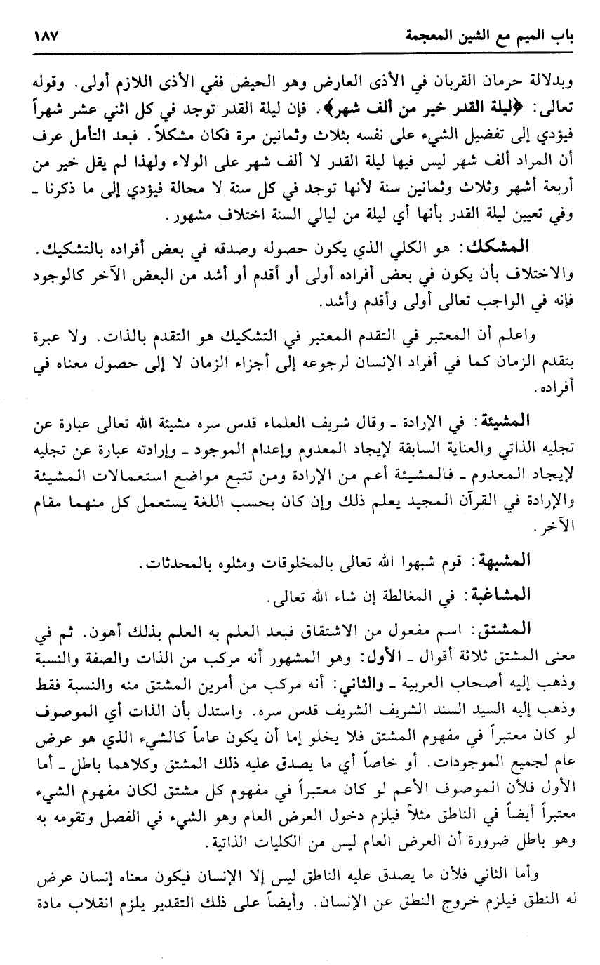 الْمَشِيئَة: فِي الْإِرَادَة - وَقَالَ شرِيف الْعلمَاء قدس سره مَشِيئَة الله تَعَالَى عبارَة عَن تجليه الذاتي والعناية السَّابِقَة لإيجاد الْمَعْدُوم وإعدام الْمَوْجُود - وإرادته عبارَة عَن تجليه لإيجاد الْمَعْدُوم - فالمشيئة أَعم من الْإِرَادَة وَمن تتبع مَوَاضِع استعمالات الْمَشِيئَة والإرادة فِي الْقُرْآن الْمجِيد يعلم ذَلِك وَإِن كَانَ بِحَسب اللُّغَة يسْتَعْمل كل مِنْهُمَا مقَام الآخر.