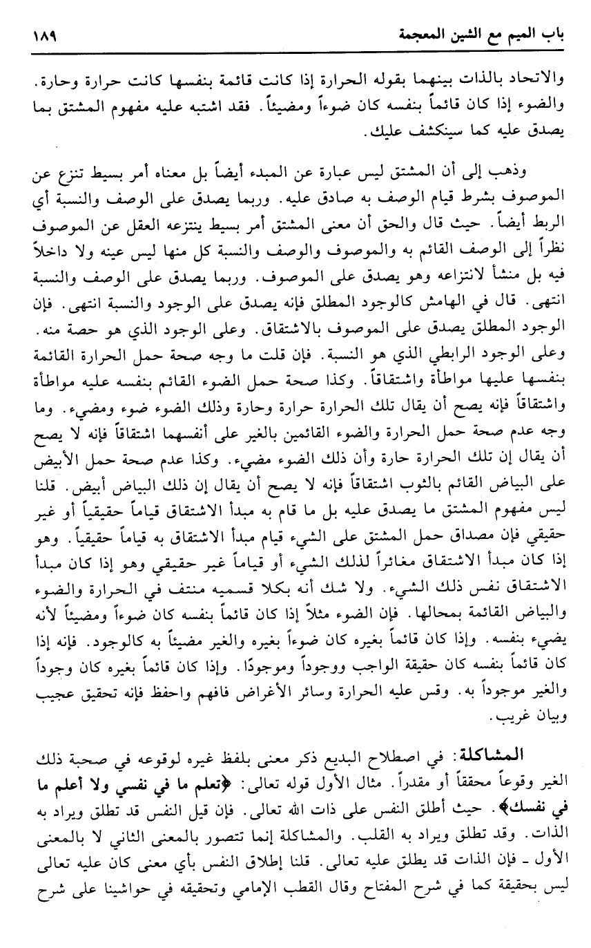 وَذهب إِلَى أَن الْمُشْتَقّ لَيْسَ عبارَة عَن المبدء أَيْضا بل مَعْنَاهُ أَمر بسيط تنْزع عَن الْمَوْصُوف بِشَرْط قيام الْوَصْف بِهِ صَادِق عَلَيْهِ. وَرُبمَا يصدق على الْوَصْف وَالنِّسْبَة أَي الرَّبْط أَيْضا. حَيْثُ قَالَ وَالْحق أَن معنى الْمُشْتَقّ أَمر بسيط ينتزعه الْعقل عَن الْمَوْصُوف نظرا إِلَى الْوَصْف الْقَائِم بِهِ والموصوف وَالْوَصْف وَالنِّسْبَة كل مِنْهَا لَيْسَ عينه وَلَا دَاخِلا فِيهِ بل منشأ لانتزاعه وَهُوَ يصدق على الْمَوْصُوف. وَرُبمَا يصدق على الْوَصْف وَالنِّسْبَة انْتهى. قَالَ فِي الْهَامِش كالوجود الْمُطلق فَإِنَّهُ يصدق على الْوُجُود وَالنِّسْبَة انْتهى. فَإِن الْوُجُود الْمُطلق يصدق على الْمَوْصُوف بالاشتقاق. وعَلى الْوُجُود الَّذِي هُوَ حِصَّة مِنْهُ. وعَلى الْوُجُود الرابطي الَّذِي هُوَ النِّسْبَة. فَإِن قلت مَا وَجه صِحَة حمل الْحَرَارَة الْقَائِمَة بِنَفسِهَا عَلَيْهَا مواطأة واشتقاقا. وَكَذَا صِحَة حمل الضَّوْء الْقَائِم بِنَفسِهِ عَلَيْهِ مواطأة واشتقاقا فَإِنَّهُ يَصح أَن يُقَال تِلْكَ الْحَرَارَة حرارة وحارة وَذَلِكَ الضَّوْء ضوء ومضيء. وَمَا وَجه عدم صِحَة حمل الْحَرَارَة والضوء القائمين بِالْغَيْر على أَنفسهمَا اشتقاقا فَإِنَّهُ لَا يَصح أَن يُقَال إِن تِلْكَ الْحَرَارَة حارة وَأَن ذَلِك الضَّوْء مضيء. وَكَذَا عدم صِحَة حمل الْأَبْيَض على الْبيَاض الْقَائِم بِالثَّوْبِ اشتقاقا فَإِنَّهُ لَا يَصح أَن يُقَال إِن ذَلِك الْبيَاض أَبيض. قُلْنَا لَيْسَ مَفْهُوم الْمُشْتَقّ مَا يصدق عَلَيْهِ بل مَا قَامَ بِهِ مبدأ الِاشْتِقَاق قيَاما حَقِيقِيًّا أَو غير حَقِيقِيّ فَإِن مصداق حمل الْمُشْتَقّ على الشَّيْء قيام مبدأ الِاشْتِقَاق بِهِ قيَاما حَقِيقِيًّا. وَهُوَ إِذا كَانَ مبدأ الِاشْتِقَاق مغائرا لذَلِك الشَّيْء أَو قيَاما غير حَقِيقِيّ وَهُوَ إِذا كَانَ مبدأ الِاشْتِقَاق نفس ذَلِك الشَّيْء. وَلَا شكّ أَنه بكلا قسميه مُنْتَفٍ فِي الْحَرَارَة والضوء وَالْبَيَاض الْقَائِمَة بمحالها. فَإِن الضَّوْء مثلا إِذا كَانَ قَائِما بِنَفسِهِ كَانَ ضوءا ومضيئا لِأَنَّهُ يضيء بِنَفسِهِ. وَإِذا كَانَ قَائِما بِغَيْرِهِ كَانَ ضوءا بِغَيْرِهِ والغير مضيئا بِهِ كالوجود. فَإِنَّهُ إِذا كَانَ قَائِما بِنَفسِهِ كَانَ حَقِيقَة الْوَاجِب ووجودا وموجودا. وَإِذا كَانَ قَائِما بِغَيْرِهِ كَانَ وجودا والغير مَوْجُودا بِهِ. وَقس عَلَيْهِ الْحَرَارَة وَسَائِر الْأَغْرَاض فَافْهَم واحفظ فَإِنَّهُ تَحْقِيق عَجِيب وَبَيَان غَرِيب.