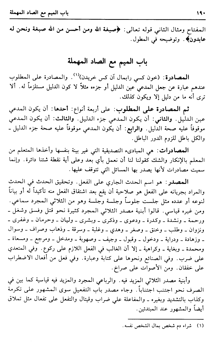 الْمصدر: هُوَ اسْم الْحَدث الْجَارِي على الْفِعْل. وَتَحْقِيق الْحَدث فِي الْحَدث وَالْمرَاد بجريانه على الْفِعْل هُوَ صَلَاحِية أَن يَقع بعد اشتقاق الْفِعْل مِنْهُ تَأْكِيدًا لَهُ أَو بَيَانا لنوعه أَو عدده مثل جَلَست جُلُوسًا وجلسة وجلسة وَهُوَ من الثلاثي الْمُجَرّد سَمَاعي. وَمن غَيره قياسي. قَالُوا أبنية مصدر الثلاثي الْمُجَرّد كَثِيرَة نَحْو قتل وَفسق وشغل - وَرَحْمَة - ونشدة - وكدرة - وَدَعوى - وذكرى - وبشرى - وليان - وحرمان - وغفرى - ونزوان - وَطلب - وخنق - وَصغر - وهدي - وَغَلَبَة - وسرقة - وَذَهَاب وصراف - وسوال - وزهادة - ودراية - وَدخُول - وَقبُول - وجيف - وصهوبة - ومدخل - ومرجع - ومسعاة - ومحمدة - وبغاية - وكراهية - إِلَّا أَن الْغَالِب فِي الْفِعْل اللَّازِم على رُكُوع. وَفِي الْمُتَعَدِّي على ضرب. وَفِي الصَّنَائِع وَنَحْوهَا على كِتَابَة وَعبارَة. وَفِي فعل من أَفعَال الِاضْطِرَاب على خفقان. وَمن الْأَصْوَات على صُرَاخ.