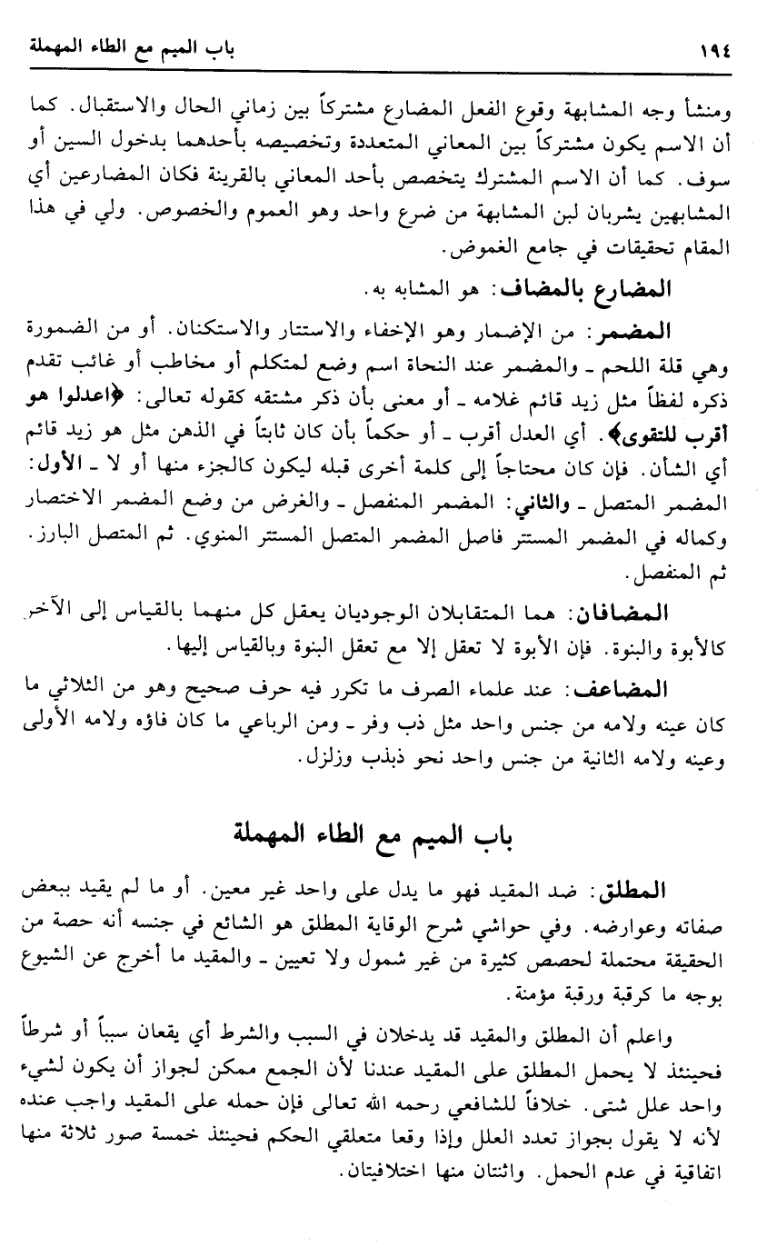 ومنشأ وَجه المشابهة وُقُوع الْفِعْل الْمُضَارع مُشْتَركا بَين زماني الْحَال والاستقبال. كَمَا أَن الِاسْم يكون مُشْتَركا بَين الْمعَانِي المتعددة وتخصيصه بِأَحَدِهِمَا بِدُخُول السِّين أَو سَوف. كَمَا أَن الِاسْم الْمُشْتَرك يتخصص بِأحد الْمعَانِي بِالْقَرِينَةِ فَكَانَ المضارعين أَي المشابهين يشربان لبن المشابهة من ضرع وَاحِد وَهُوَ الْعُمُوم وَالْخُصُوص. ولي فِي هَذَا الْمقَام تحقيقات فِي جَامع الغموض.