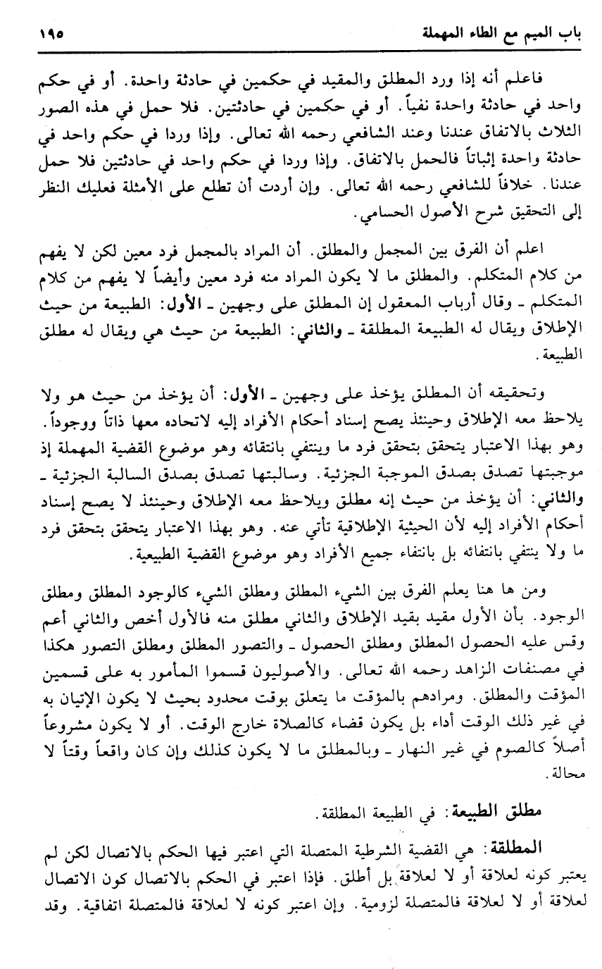 اعْلَم أَن الْفرق بَين الْمُجْمل وَالْمُطلق. أَن المُرَاد بالمجمل فَرد معِين لَكِن لَا يفهم من كَلَام الْمُتَكَلّم. وَالْمُطلق مَا لَا يكون المُرَاد مِنْهُ فَرد معِين وَأَيْضًا لَا يفهم من كَلَام الْمُتَكَلّم - وَقَالَ أَرْبَاب الْمَعْقُول إِن الْمُطلق على وَجْهَيْن - الأول: الطبيعية من حَيْثُ الْإِطْلَاق وَيُقَال لَهُ الطبيعة الْمُطلقَة - وَالثَّانِي: الطبيعة من حَيْثُ هِيَ وَيُقَال لَهُ مُطلق الطبيعة.