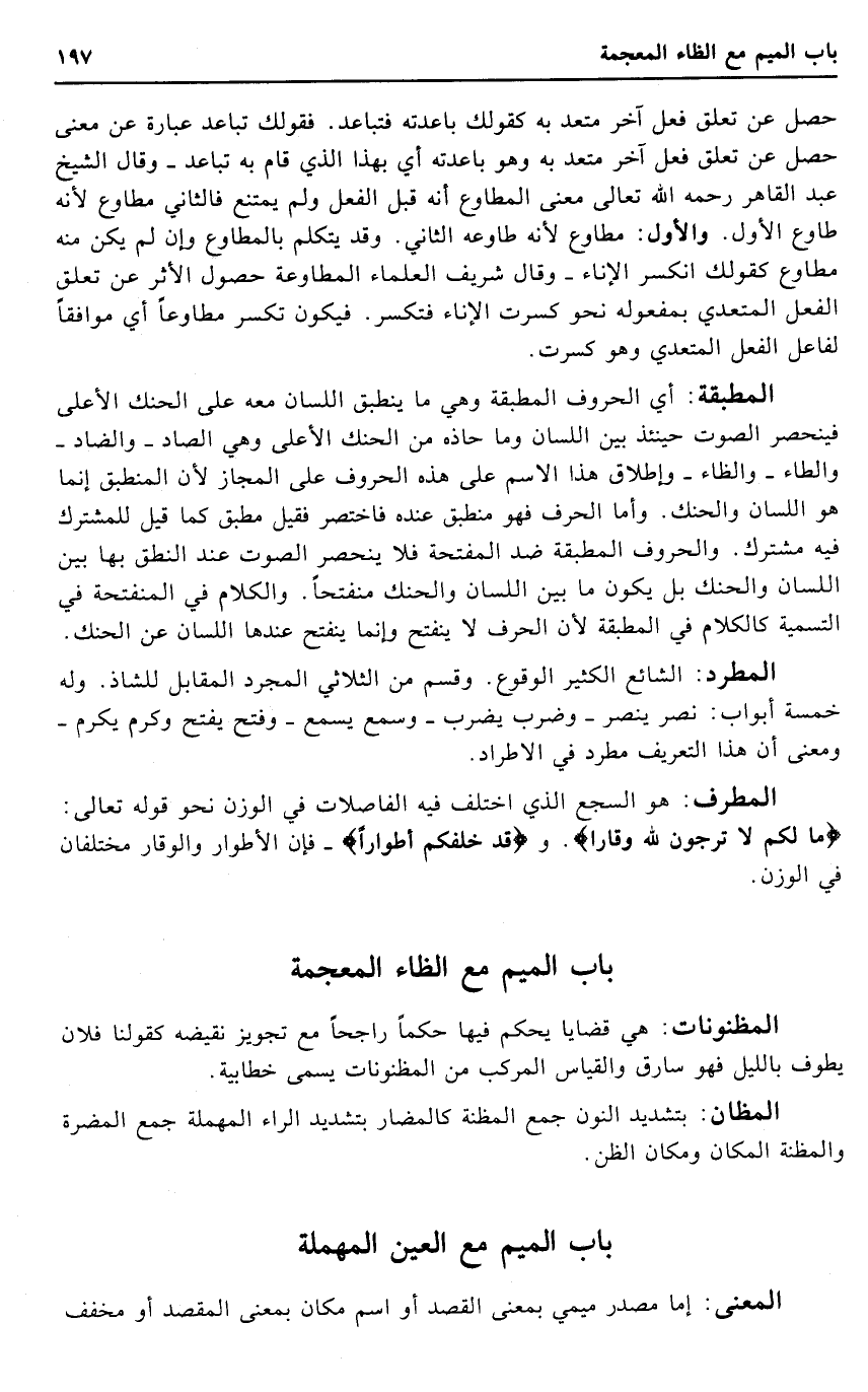 حصل عَن تعلق فعل آخر مُتَعَدٍّ بِهِ كَقَوْلِك باعدته فتباعد. فقولك تبَاعد عبارَة عَن معنى حصل عَن تعلق فعل آخر مُتَعَدٍّ بِهِ وَهُوَ باعدته أَي بِهَذَا الَّذِي قَامَ بِهِ تبَاعد - وَقَالَ الشَّيْخ عبد القاهر رَحمَه الله تَعَالَى معنى المطاوع أَنه قبل الْفِعْل وَلم يمْتَنع فَالثَّانِي مُطَاوع لِأَنَّهُ طاوع الأول. وَالْأول: مُطَاوع لِأَنَّهُ طاوعه الثَّانِي. وَقد يتَكَلَّم بالمطاوع وَإِن لم يكن مِنْهُ مُطَاوع كَقَوْلِك انْكَسَرَ الْإِنَاء - وَقَالَ شرِيف الْعلمَاء المطاوعة حُصُول الْأَثر عَن تعلق الْفِعْل الْمُتَعَدِّي بمفعوله نَحْو كسرت الْإِنَاء فتكسر. فَيكون تكسر مطاوعا أَي مُوَافقا لفاعل الْفِعْل الْمُتَعَدِّي وَهُوَ كسرت.