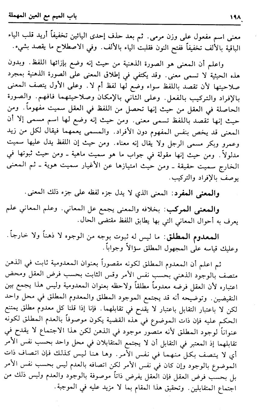 ثمَّ اعْلَم أَن الْمَعْدُوم الْمُطلق لكَونه مَقْصُورا بعنوان المعدومية ثَابت فِي الذِّهْن متصف بالوجود الذهْنِي بِحَسب نفس الْأَمر وَقس الثَّابِت بِحَسب فرض الْعقل ومحض اعْتِبَاره لِأَن الْعقل فَرْضه مَعْدُوما مُطلقًا ولاحظه بعنوان المعدومية وَلَيْسَ هَذَا يجمع بَين النقيضين. وتوضيحه أَنه قد يجْتَمع الْمَوْجُود الْمُطلق والمعدوم الْمُطلق فِي مَحل وَاحِد لَكِن لَا بِاعْتِبَار التقابل بِاعْتِبَار لَا يقْدَح فِي تقابلهما. فَإنَّا إِذا قُلْنَا كل مَعْدُوم مُطلق يمْتَنع الحكم عَلَيْهِ فَإِن ذَات الْمَوْضُوع فِي هَذِه الْقَضِيَّة يكون مَوْصُوفا بِالْعدمِ الْمُطلق لكَونه عنوانا لوُجُود الْمُطلق لِأَنَّهُ مُتَصَوّر مَوْجُود فِي الذِّهْن لَكِن هَذَا الِاجْتِمَاع لَا يقْدَح فِي تقابلهما إِذْ الْمُعْتَبر فِي التقابل أَن لَا يجْتَمع المتقابلان فِي مَحل وَاحِد بِحَسب نفس الْأَمر أَي لَا يَتَّصِف بِكُل مِنْهُمَا فِي نفس الْأَمر. وَهَا هُنَا لَيْسَ كَذَلِك فَإِن اتصاف ذَات الْمَوْضُوع بالوجود وَإِن كَانَ فِي نفس الْأَمر لَكِن اتصافه بِالْعدمِ لَيْسَ بِحَسب نفس الْأَمر بل بِحَسب فرض الْعقل فَإِن الْعقل يفْرض ذاتا مَوْصُوفَة بالوجود والعدم وَلَيْسَ ذَلِك من اجْتِمَاع المتقابلين. وَتَحْقِيق هَذَا الْمقَام بِمَا لَا مزِيد عَلَيْهِ فِي الْمُوجبَة.