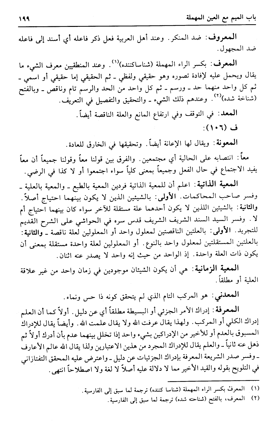 الْمَعِيَّة الذاتية: اعْلَم أَن للمعية الذاتية فردين الْمَعِيَّة بالطبع - والمعية بالعلية - وَفسّر صَاحب المحاكمات. الأولى: بالشيئين الَّذين لَا يكون بَينهمَا احْتِيَاج أصلا. وَالثَّانيَِة: بالشيئين اللَّذين لَا يكون أَحدهمَا عِلّة مُسْتَقلَّة للْآخر سَوَاء كَانَ بَينهمَا احْتِيَاج أم لَا. وَفسّر السَّيِّد السَّنَد الشريف الشريف قدس سره فِي الْحَوَاشِي على الشَّرْح الْقَدِيم للتجريد. الأولى: بالعلتين الناقصتين لمعلول وَاحِد أَو المعلولين لعِلَّة نَاقِصَة - وَالثَّانيَِة: بالعلتين المستقلتين لمعلول وَاحِد بالنوع. أَو المعلولين لعِلَّة وَاحِدَة مُسْتَقلَّة بِمَعْنى أَن يكون ذَات الْعلَّة وَاحِدَة. إِذْ الْوَاحِد من حَيْثُ إِنَّه وَاحِد لَا يصدر عَنهُ اثْنَان.