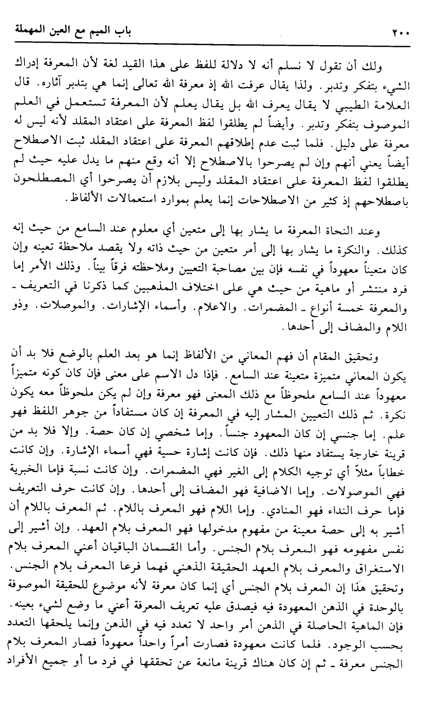 وَتَحْقِيق الْمقَام أَن فهم الْمعَانِي من الْأَلْفَاظ إِنَّمَا هُوَ بعد الْعلم بِالْوَضْعِ فَلَا بُد أَن يكون الْمعَانِي متميزة متعينة عِنْد السَّامع. فَإِذا دلّ الِاسْم على معنى فَإِن كَانَ كَونه متميزا معهودا عِنْد السَّامع ملحوظا مَعَ ذَلِك الْمَعْنى فَهُوَ معرفَة وَإِن لم يكن ملحوظا مَعَه يكون نكرَة. ثمَّ ذَلِك التَّعْيِين الْمشَار إِلَيْهِ فِي الْمعرفَة إِن كَانَ مستفادا من جَوْهَر اللَّفْظ فَهُوَ علم. إِمَّا جنسي إِن كَانَ الْمَعْهُود جِنْسا. وَإِمَّا شخصي إِن كَانَ حِصَّة. وَإِلَّا فَلَا بُد من قرينَة خَارِجَة يُسْتَفَاد مِنْهَا ذَلِك. فَإِن كَانَت إِشَارَة حسية فَهِيَ أَسمَاء الْإِشَارَة. وَإِن كَانَت خطابا مثلا أَي تَوْجِيه الْكَلَام إِلَى الْغَيْر فَهِيَ الْمُضْمرَات. وَإِن كَانَت نِسْبَة فإمَّا الخبرية فَهِيَ الموصولات. وَإِمَّا الإضافية فَهُوَ الْمُضَاف إِلَى أَحدهَا. وَإِن كَانَت حرف التَّعْرِيف فإمَّا حرف النداء فَهُوَ الْمُنَادِي. وَإِمَّا اللَّام فَهُوَ الْمُعَرّف بِاللَّامِ. ثمَّ الْمُعَرّف بِاللَّامِ أَن أُشير بِهِ إِلَى حِصَّة مُعينَة من مَفْهُوم مدخولها فَهُوَ الْمُعَرّف بلام الْعَهْد. وَإِن أُشير إِلَى نفس مَفْهُومه فَهُوَ الْمُعَرّف بلام الْجِنْس. وَأما القسمان الباقيان أَعنِي الْمُعَرّف بلام الِاسْتِغْرَاق والمعرف بلام الْعَهْد الْحَقِيقَة الذهْنِي فهما فرعا الْمُعَرّف بلام الْجِنْس. وَتَحْقِيق هَذَا إِن الْمُعَرّف بلام الْجِنْس أَي إِنَّمَا كَانَ معرفَة لِأَنَّهُ مَوْضُوع للْحَقِيقَة الموصوفة بالوحدة فِي الذِّهْن الْمَعْهُودَة فِيهِ فَيصدق عَلَيْهِ تَعْرِيف الْمعرفَة أَعنِي مَا وضع لشَيْء بِعَيْنِه. فَإِن الْمَاهِيّة الْحَاصِلَة فِي الذِّهْن أَمر وَاحِد لَا تعدد فِيهِ فِي الذِّهْن وَإِنَّمَا يلْحقهَا التَّعَدُّد بِحَسب الْوُجُود. فَلَمَّا كَانَت معهودة فَصَارَت أمرا وَاحِدًا معهودا فَصَارَ الْمُعَرّف بلام الْجِنْس معرفَة - ثمَّ إِن كَانَ هُنَاكَ قرينَة مَانِعَة عَن تحققها فِي فَرد مَا أَو جَمِيع الْأَفْرَاد