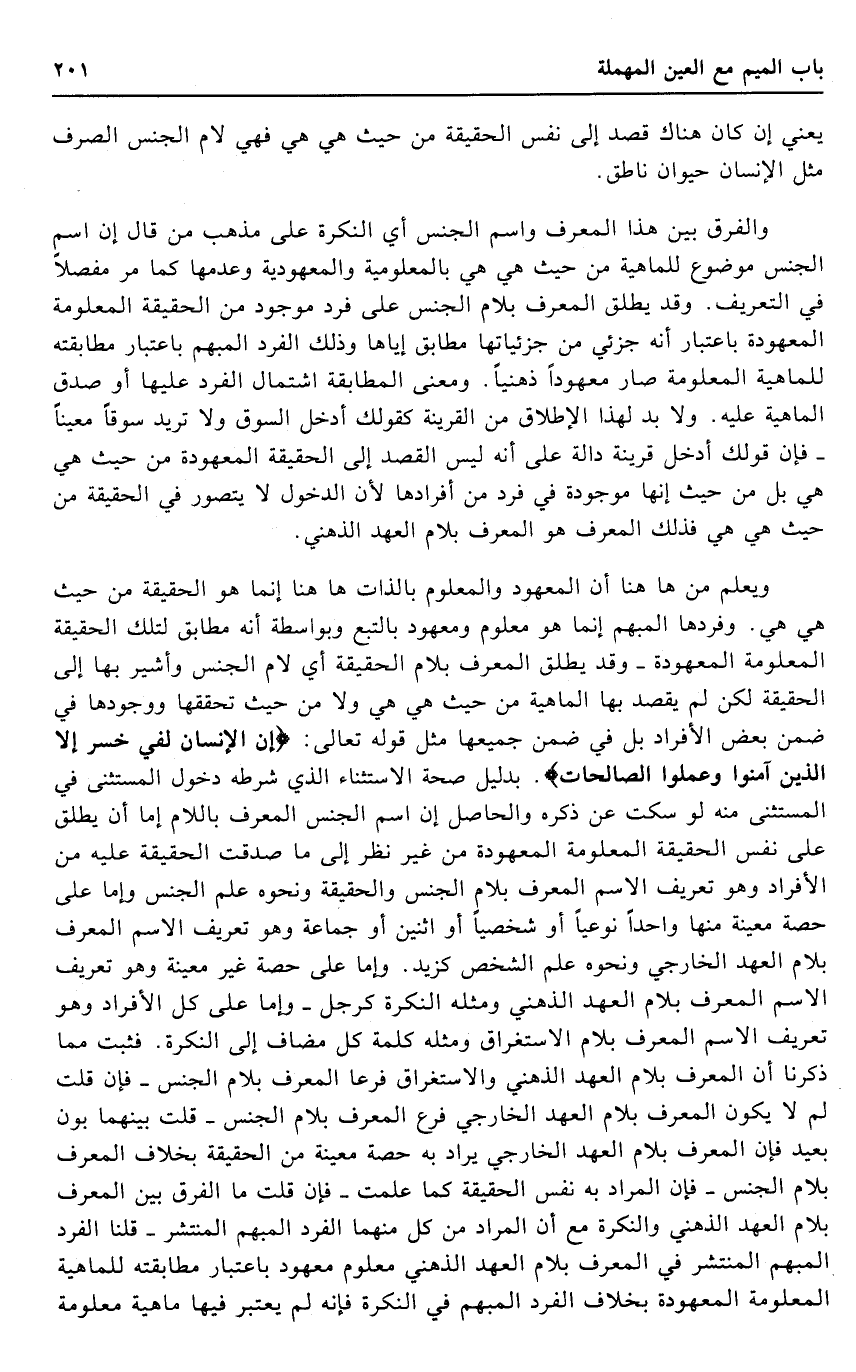 وَيعلم من هَا هُنَا أَن الْمَعْهُود والمعلوم بِالذَّاتِ هَا هُنَا إِنَّمَا هُوَ الْحَقِيقَة من حَيْثُ هِيَ هِيَ. وفردها الْمُبْهم إِنَّمَا هُوَ مَعْلُوم ومعهود بالتبع وبواسطة أَنه مُطَابق لتِلْك الْحَقِيقَة الْمَعْلُومَة الْمَعْهُودَة - وَقد يُطلق الْمُعَرّف بلام الْحَقِيقَة أَي لَام الْجِنْس وأشير بهَا إِلَى الْحَقِيقَة لَكِن لم يقْصد بهَا الْمَاهِيّة من حَيْثُ هِيَ هِيَ وَلَا من حَيْثُ تحققها ووجودها فِي ضمن بعض الْأَفْرَاد بل فِي ضمن جَمِيعهَا مثل قَوْله تَعَالَى: {إِن الْإِنْسَان لفي خسر إِلَّا الَّذين آمنُوا وَعمِلُوا الصَّالِحَات} . بِدَلِيل صِحَة الِاسْتِثْنَاء الَّذِي شَرطه دُخُول الْمُسْتَثْنى فِي الْمُسْتَثْنى مِنْهُ لَو سكت عَن ذكره وَالْحَاصِل إِن اسْم الْجِنْس الْمُعَرّف بِاللَّامِ إِمَّا أَن يُطلق على نفس الْحَقِيقَة الْمَعْلُومَة الْمَعْهُودَة من غير نظر إِلَى مَا صدقت الْحَقِيقَة عَلَيْهِ من الْأَفْرَاد وَهُوَ تَعْرِيف الِاسْم الْمُعَرّف بلام الْجِنْس والحقيقة وَنَحْوه علم الْجِنْس وَإِمَّا على حِصَّة مُعينَة مِنْهَا وَاحِدًا نوعيا أَو شخصيا أَو اثْنَيْنِ أَو جمَاعَة وَهُوَ تَعْرِيف الِاسْم الْمُعَرّف بلام الْعَهْد الْخَارِجِي وَنَحْوه علم الشَّخْص كزيد. وَإِمَّا على حِصَّة غير مُعينَة وَهُوَ تَعْرِيف الِاسْم الْمُعَرّف بلام الْعَهْد الذهْنِي وَمثله النكرَة كَرجل - وَإِمَّا على كل الْأَفْرَاد وَهُوَ تَعْرِيف الِاسْم الْمُعَرّف بلام الِاسْتِغْرَاق وَمثله كلمة كل مُضَاف إِلَى النكرَة. فَثَبت مِمَّا ذكرنَا أَن الْمُعَرّف بلام الْعَهْد الذهْنِي والاستغراق فرعا الْمُعَرّف بلام الْجِنْس - فَإِن قلت لم لَا يكون الْمُعَرّف بلام الْعَهْد الْخَارِجِي فرع الْمُعَرّف بلام الْجِنْس - قلت بَينهمَا بون بعيد فَإِن الْمُعَرّف بلام الْعَهْد الْخَارِجِي يُرَاد بِهِ حِصَّة مُعينَة من الْحَقِيقَة بِخِلَاف الْمُعَرّف بلام الْجِنْس - فَإِن المُرَاد بِهِ نفس الْحَقِيقَة كَمَا علمت - فَإِن قلت مَا الْفرق بَين الْمُعَرّف بلام الْعَهْد الذهْنِي والنكرة مَعَ أَن المُرَاد من كل مِنْهُمَا الْفَرد الْمُبْهم الْمُنْتَشِر - قُلْنَا الْفَرد الْمُبْهم الْمُنْتَشِر فِي الْمُعَرّف بلام الْعَهْد الذهْنِي مَعْلُوم مَعْهُود بِاعْتِبَار مطابقته للماهية الْمَعْلُومَة الْمَعْهُودَة بِخِلَاف الْفَرد الْمُبْهم فِي النكرَة فَإِنَّهُ لم يعْتَبر فِيهَا مَاهِيَّة مَعْلُومَة