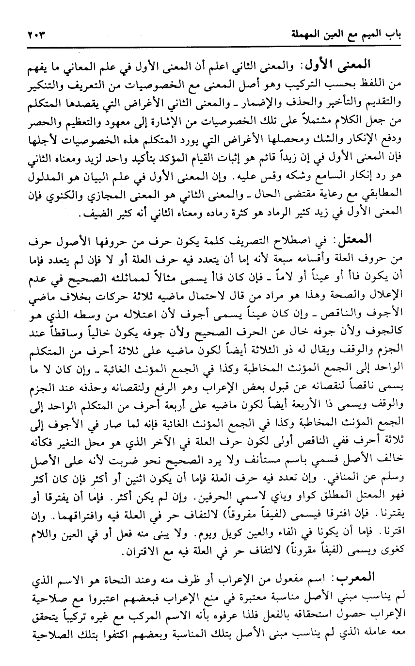 المعتل: فِي اصْطِلَاح التصريف كلمة يكون حرف من حروفها الْأُصُول حرف من حُرُوف الْعلَّة وأقسامه سَبْعَة لِأَنَّهُ إِمَّا أَن يَتَعَدَّد فِيهِ حرف الْعلَّة أَو لَا فَإِن لم يَتَعَدَّد فإمَّا أَن يكون فاأ أَو عينا أَو لاما - فَإِن كَانَ فاأ يُسمى مِثَالا لمماثلته الصَّحِيح فِي عدم الإعلال وَالصِّحَّة وَهَذَا هُوَ مُرَاد من قَالَ لاحْتِمَال ماضيه ثَلَاثَة حركات بِخِلَاف ماضي الأجوف والناقص - وَإِن كَانَ عينا يُسمى أجوف لِأَن اعتلاله من وَسطه الَّذِي هُوَ كالجوف وَلِأَن جَوْفه خَال عَن الْحَرْف الصَّحِيح وَلِأَن جَوْفه يكون خَالِيا وساقطا عِنْد الْجَزْم وَالْوَقْف وَيُقَال لَهُ ذُو الثَّلَاثَة أَيْضا لكَون ماضيه على ثَلَاثَة أحرف من الْمُتَكَلّم الْوَاحِد إِلَى الْجمع الْمُؤَنَّث المخاطبة وَكَذَا فِي الْجمع الْمُؤَنَّث الغائبة - وَإِن كَانَ لَا مَا يُسمى نَاقِصا لنقصانه عَن قبُول بعض الْإِعْرَاب وَهُوَ الرّفْع ولنقصانه وحذفه عِنْد الْجَزْم وَالْوَقْف وَيُسمى ذَا الْأَرْبَعَة أَيْضا لكَون ماضيه على أَرْبَعَة أحرف من الْمُتَكَلّم الْوَاحِد إِلَى الْجمع الْمُؤَنَّث المخاطبة وَكَذَا فِي الْجمع الْمُؤَنَّث الغائبة فَإِنَّهُ لما صَار فِي الأجوف إِلَى ثَلَاثَة أحرف فَفِي النَّاقِص أولى لكَون حرف الْعلَّة فِي الآخر الَّذِي هُوَ مَحل التَّغَيُّر فَكَأَنَّهُ خَالف الأَصْل فَسُمي باسم مُسْتَأْنف وَلَا يرد الصَّحِيح نَحْو ضربت لِأَنَّهُ على الأَصْل وَسلم عَن الْمنَافِي. وَإِن تعدد فِيهِ حرف الْعلَّة فإمَّا أَن يكون اثْنَيْنِ أَو أَكثر فَإِن كَانَ أَكثر فَهُوَ المعتل الْمُطلق كواو وياي لاسمي الحرفين. وَإِن لم يكن أَكثر. فإمَّا أَن يفترقا أَو يقترنا. فَإِن افْتَرقَا فيسمى (لفيفا مفروقا) لالتفاف حر فِي الْعلَّة فِيهِ وافتراقهما. وَإِن اقترنا. فإمَّا أَن يَكُونَا فِي الْفَاء وَالْعين كويل وَيَوْم. وَلَا يبْنى مِنْهُ فعل أَو فِي الْعين وَاللَّام كغوى وَيُسمى (لفيفا مَقْرُونا) لالتفاف حر فِي الْعلَّة فِيهِ مَعَ الاقتران.