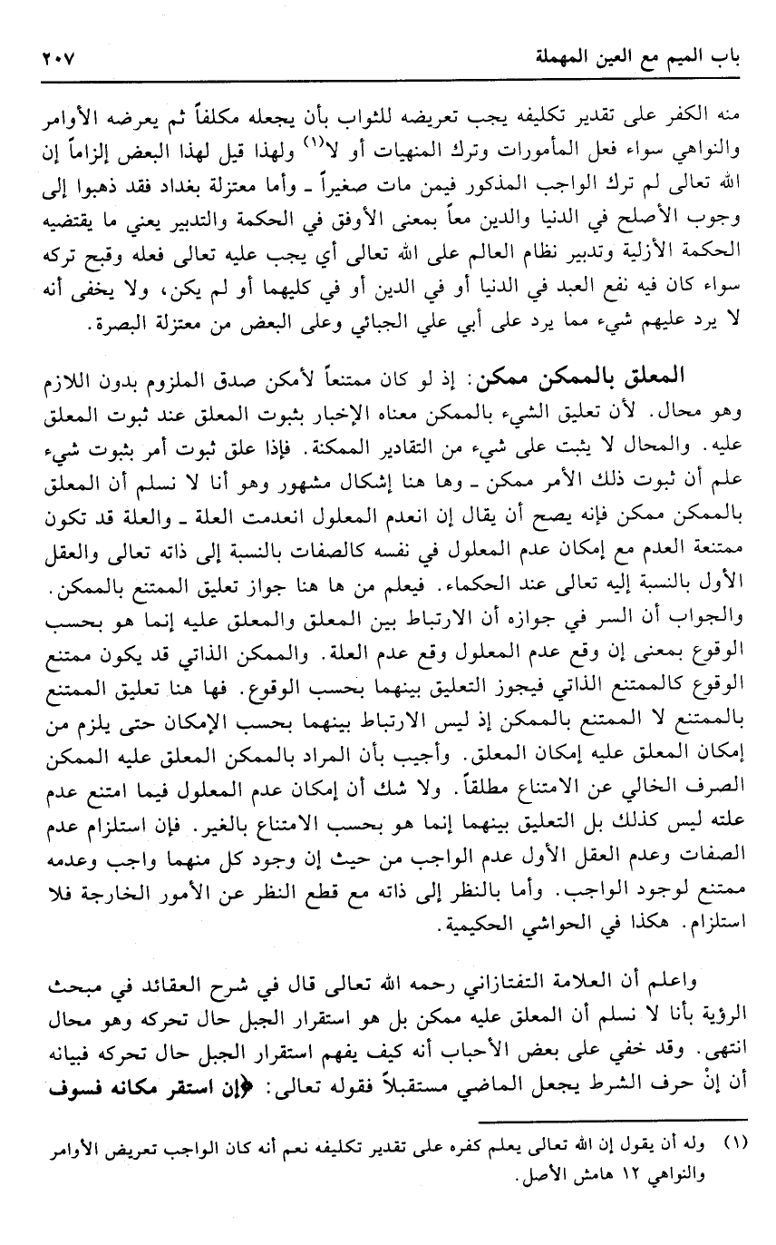 الْمُعَلق بالممكن مُمكن: إِذْ لَو كَانَ مُمْتَنعا لأمكن صدق الْمَلْزُوم بِدُونِ اللَّازِم وَهُوَ محَال. لِأَن تَعْلِيق الشَّيْء بالممكن مَعْنَاهُ الْإِخْبَار بِثُبُوت الْمُعَلق عِنْد ثُبُوت الْمُعَلق عَلَيْهِ. والمحال لَا يثبت على شَيْء من التقادير الممكنة. فَإِذا علق ثُبُوت أَمر بِثُبُوت شَيْء علم أَن ثُبُوت ذَلِك الْأَمر مُمكن - وَهَا هُنَا إِشْكَال مَشْهُور وَهُوَ أَنا لَا نسلم أَن الْمُعَلق بالممكن مُمكن فَإِنَّهُ يَصح أَن يُقَال إِن انْعَدم الْمَعْلُول انعدمت الْعلَّة - وَالْعلَّة قد تكون ممتنعة الْعَدَم مَعَ إِمْكَان عدم الْمَعْلُول فِي نَفسه كالصفات بِالنِّسْبَةِ إِلَى ذَاته تَعَالَى وَالْعقل الأول بِالنِّسْبَةِ إِلَيْهِ تَعَالَى عِنْد الْحُكَمَاء. فَيعلم من هَا هُنَا جَوَاز تَعْلِيق الْمُمْتَنع بالممكن. وَالْجَوَاب أَن السِّرّ فِي جَوَازه أَن الارتباط بَين الْمُعَلق وَالْمُعَلّق عَلَيْهِ إِنَّمَا هُوَ بِحَسب الْوُقُوع بِمَعْنى إِن وَقع عدم الْمَعْلُول وَقع عدم الْعلَّة. والممكن الذاتي قد يكون مُمْتَنع الْوُقُوع كالممتنع الذاتي فَيجوز التَّعْلِيق بَينهمَا بِحَسب الْوُقُوع. فها هُنَا تَعْلِيق الْمُمْتَنع بالممتنع لَا الْمُمْتَنع بالممكن إِذْ لَيْسَ الارتباط بَينهمَا بِحَسب الْإِمْكَان حَتَّى يلْزم من إِمْكَان الْمُعَلق عَلَيْهِ إِمْكَان الْمُعَلق. وَأجِيب بِأَن المُرَاد بالممكن الْمُعَلق عَلَيْهِ الْمُمكن الصّرْف الْخَالِي عَن الِامْتِنَاع مُطلقًا. وَلَا شكّ أَن إِمْكَان عدم الْمَعْلُول فِيمَا امْتنع عدم علته لَيْسَ كَذَلِك بل التَّعْلِيق بَينهمَا إِنَّمَا هُوَ بِحَسب الِامْتِنَاع بِالْغَيْر. فَإِن استلزام عدم الصِّفَات وَعدم الْعقل الأول عدم الْوَاجِب من حَيْثُ إِن وجود كل مِنْهُمَا وَاجِب وَعَدَمه مُمْتَنع لوُجُود الْوَاجِب. وَأما بِالنّظرِ إِلَى ذَاته مَعَ قطع النّظر عَن الْأُمُور الْخَارِجَة فَلَا استلزام. هَكَذَا فِي الْحَوَاشِي الحكيمية.