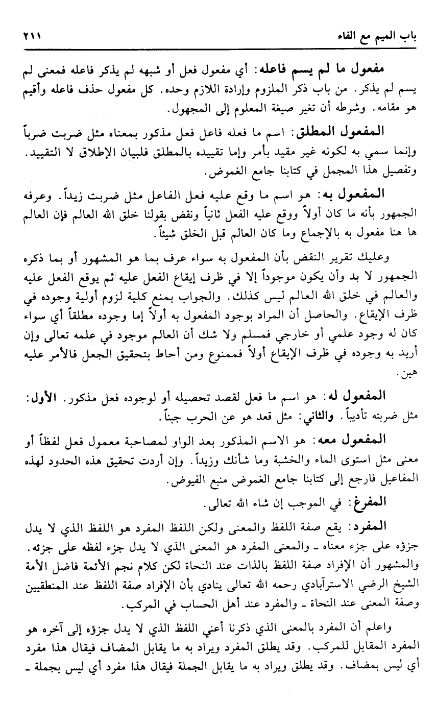 الْمَفْعُول الْمُطلق: اسْم مَا فعله فَاعل فعل مَذْكُور بِمَعْنَاهُ مثل ضربت ضربا وَإِنَّمَا سمي بِهِ لكَونه غير مُقَيّد بِأَمْر وَإِمَّا تَقْيِيده بالمطلق فلبيان الْإِطْلَاق لَا التَّقْيِيد. وتفصيل هَذَا الْمُجْمل فِي كتَابنَا جَامع الغموض.